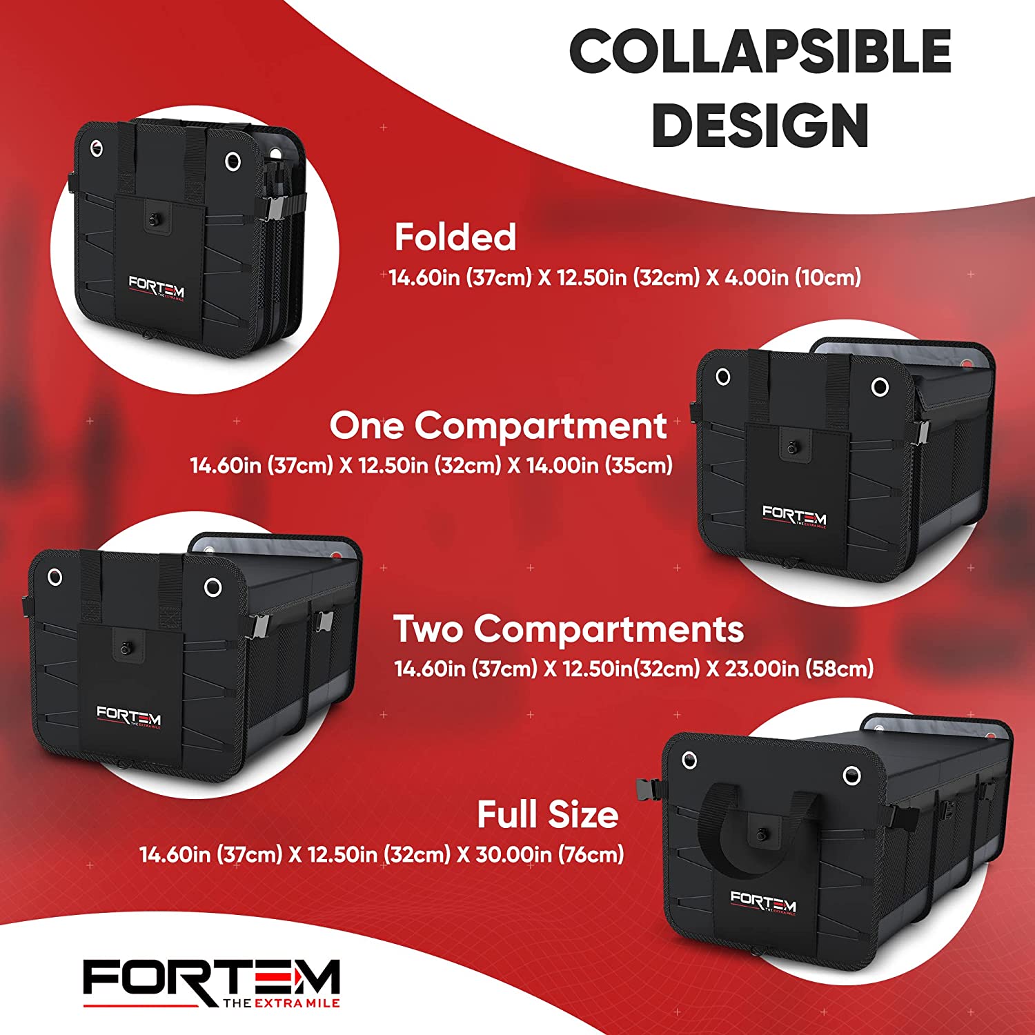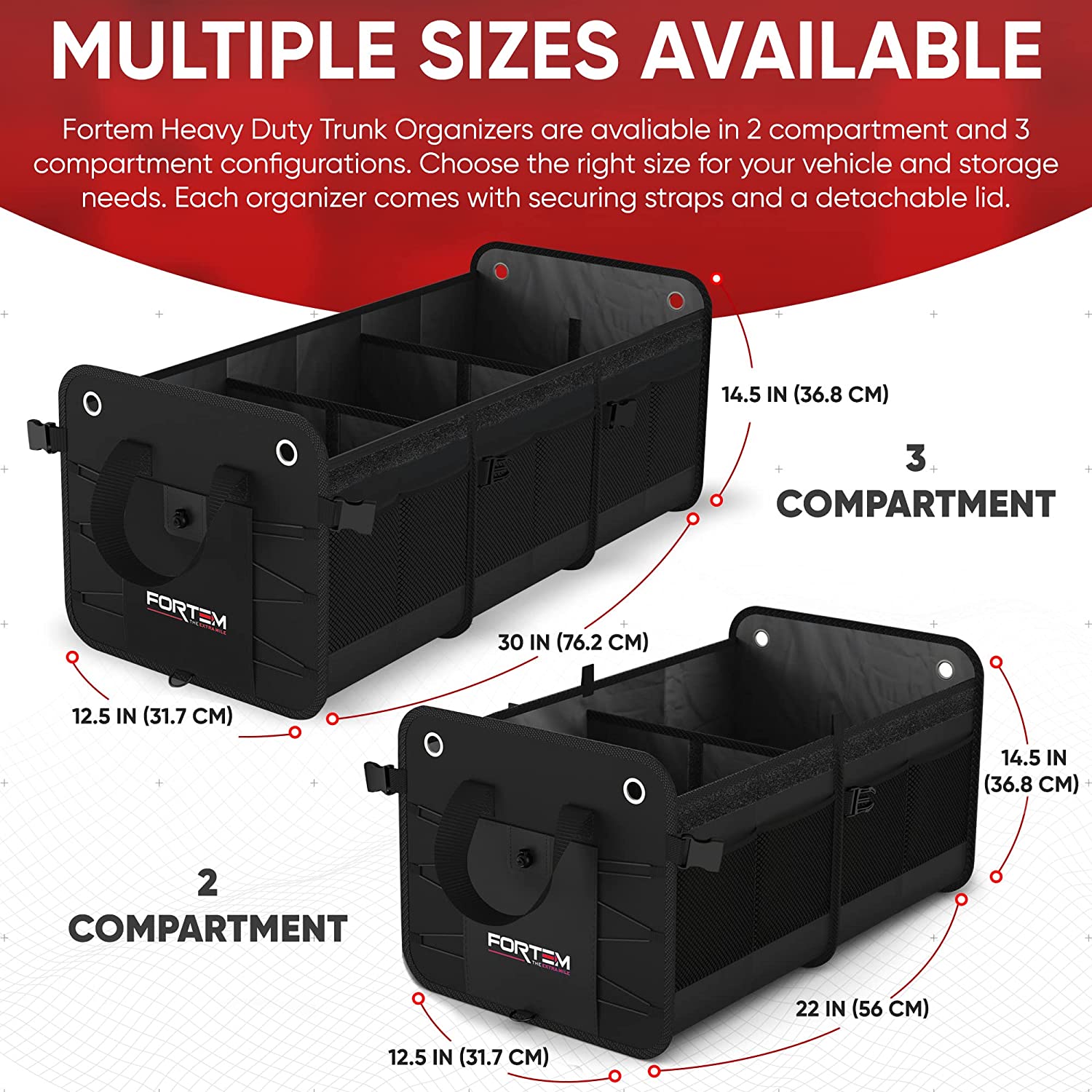 FORTEM Car Trunk Organizer. SUV Trunk Organizer. Car Storage Organizer. Collapsible Multi Compartment Car Organizer. Non Slip Bottom. Adjustable Securing Straps. Foldable Cover (3 Compartments. Black)