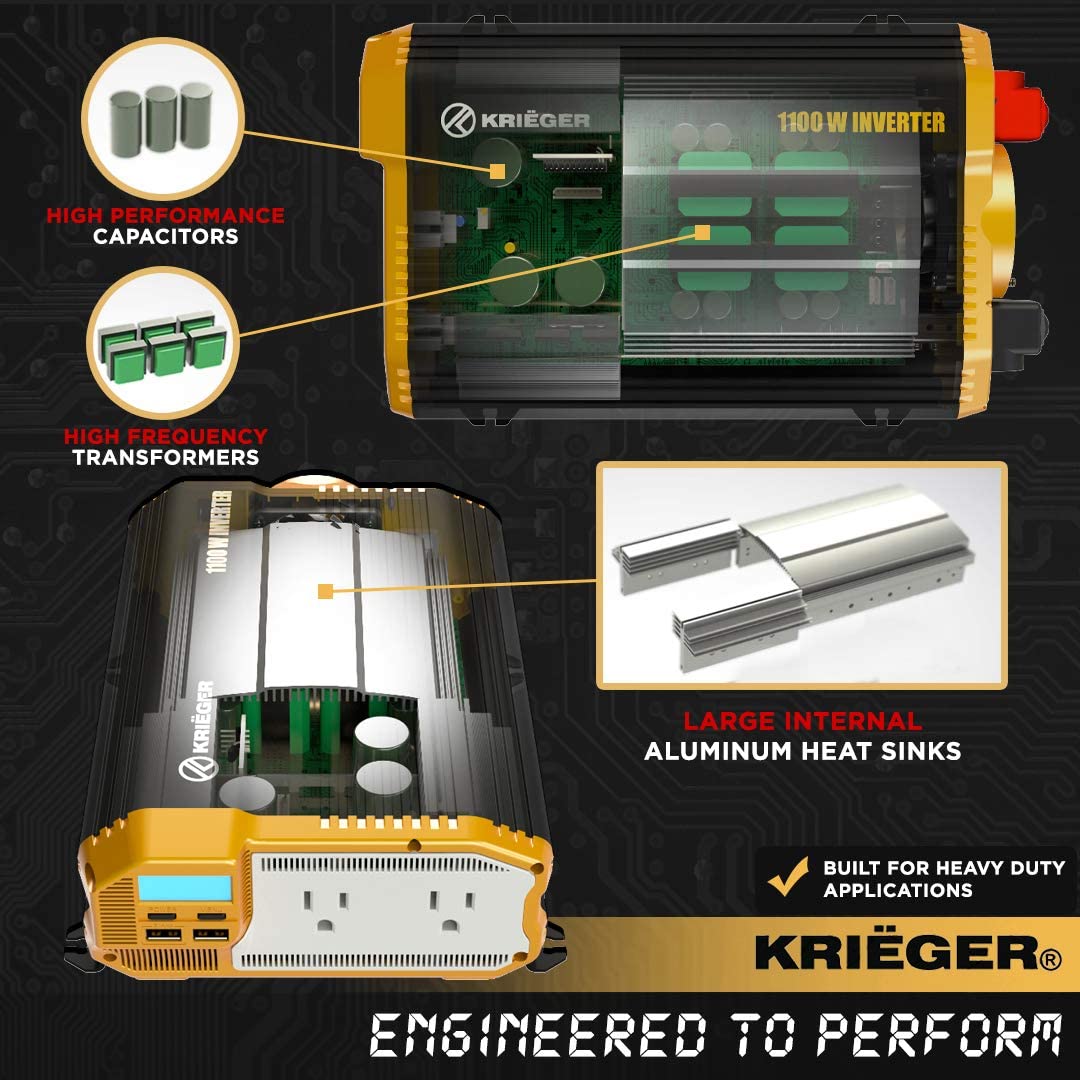 Krieger 1100 Watt 12V Power Inverter Dual 110V AC Outlets. Installation Kit Included. Automotive Back Up Power Supply For Blenders. Vacuums. Power Tools - ETL Approved Under UL STD 458