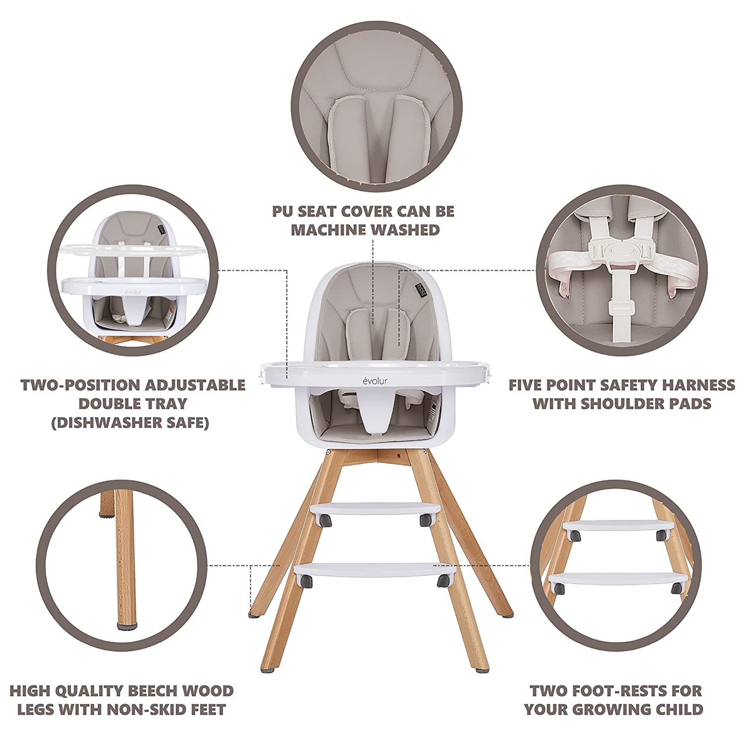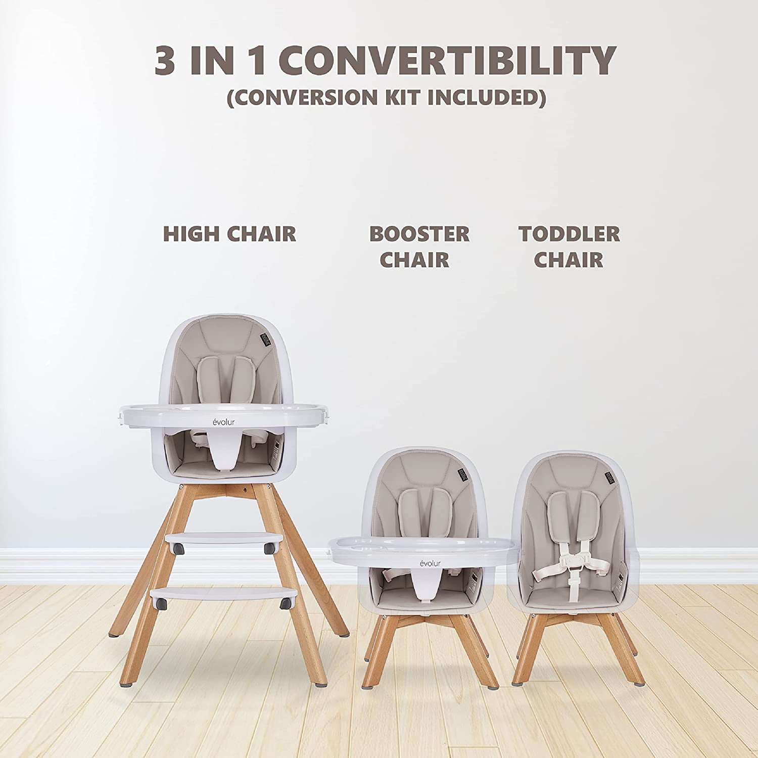 Evolur Zoodle 3-in-1 High Chair I Booster Feeding Chair I Modern Design I Toddler Chair I Removable Cushion I Adjustable Tray I Baby and Toddler. Light Grey