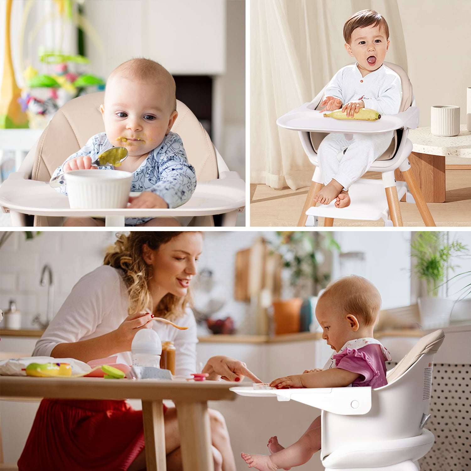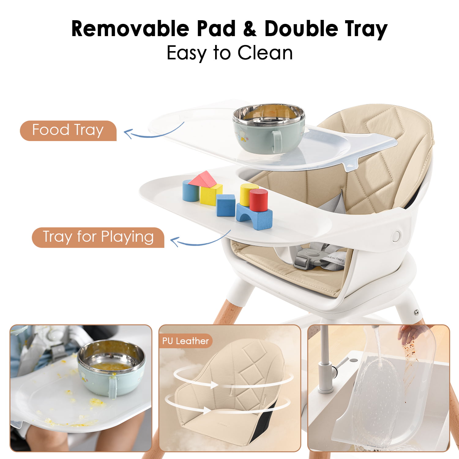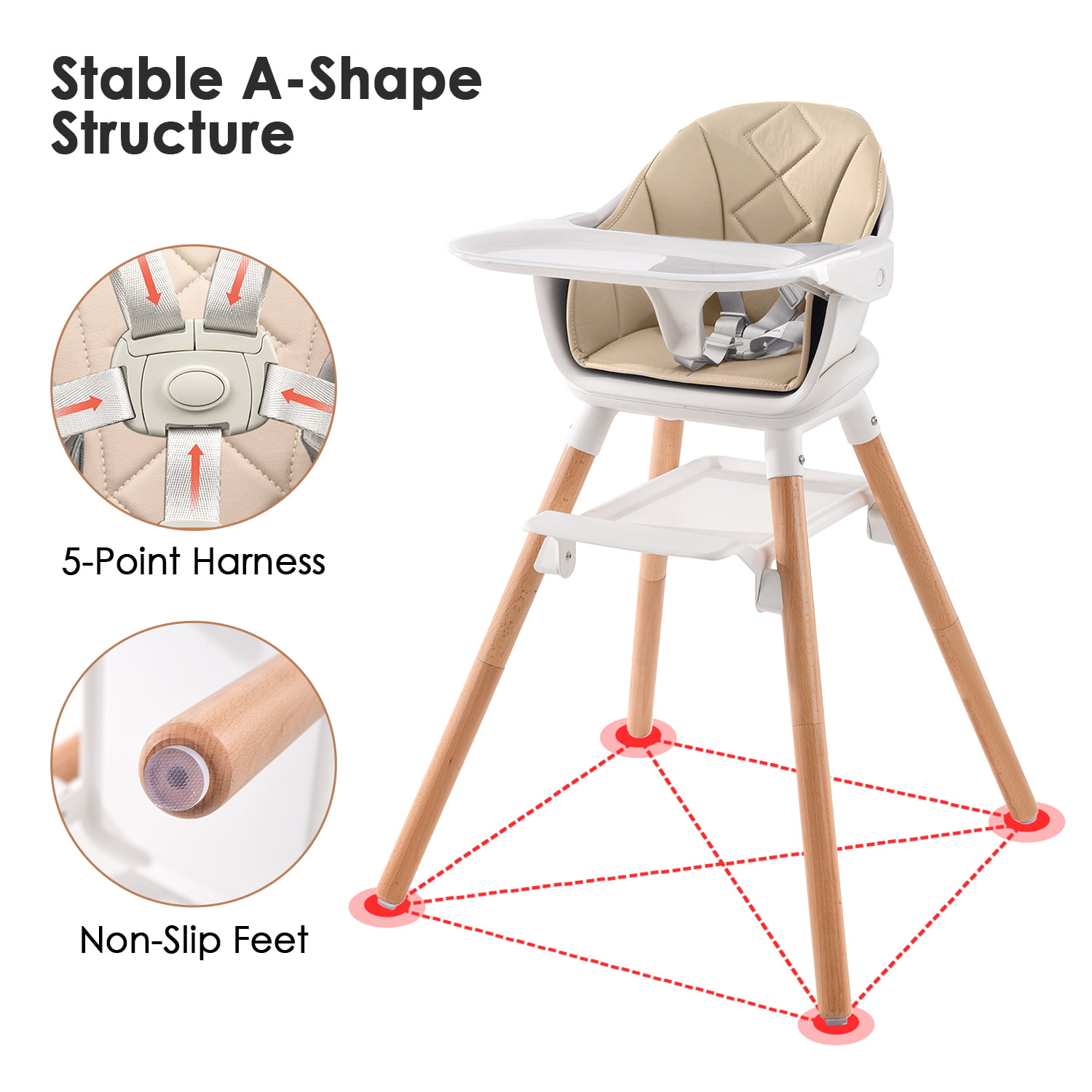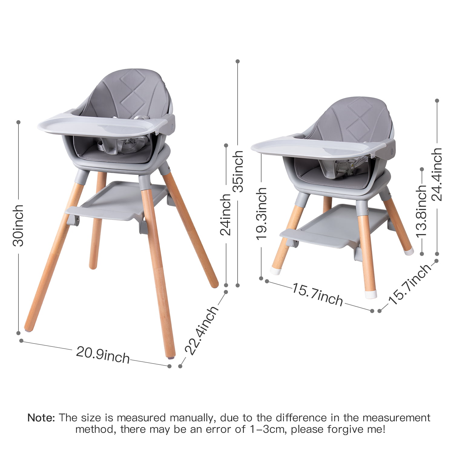 Beberoad Love Baby High Chair. 4 in 1 Wooden Highchair Convertible High Chair Booster Toddler Chair with Double Removable Tray. 5-Point Harness & PU Cushion for Babies Infants Toddlers Grey