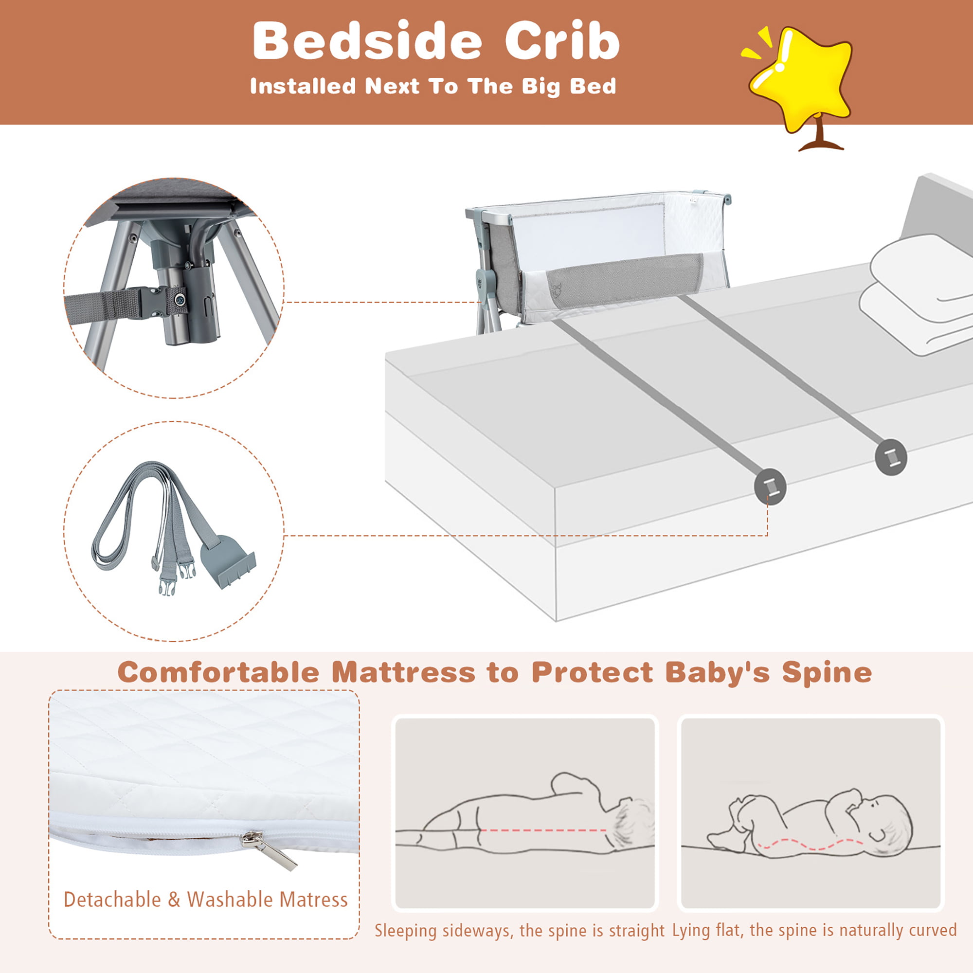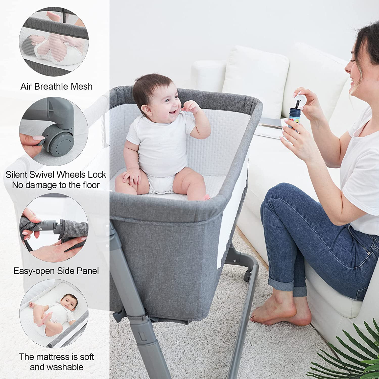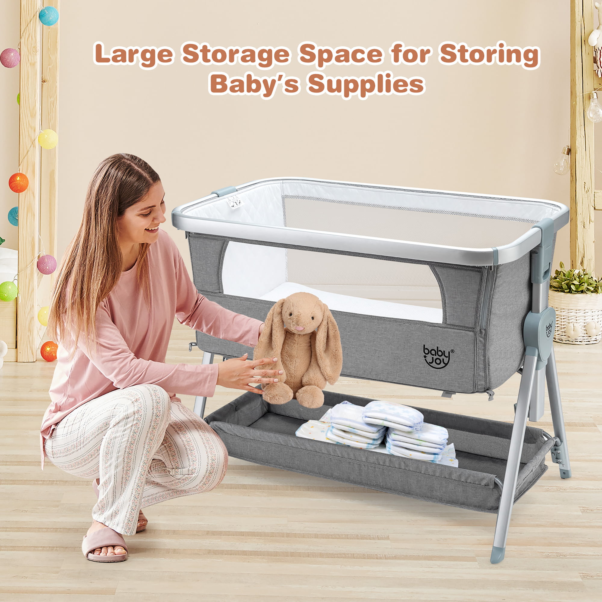 Babyjoy Baby Bed Side Crib Portable Adjustable Infant Travel Sleeper Bassinet Light Grey