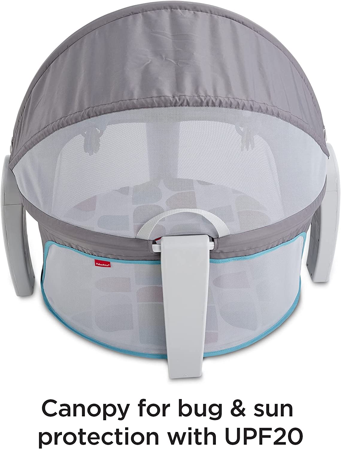 Fisher-Price Portable Bassinet and Play Space On-The-Go Baby Dome with Developmental Toys and Canopy. Grey Bubbles