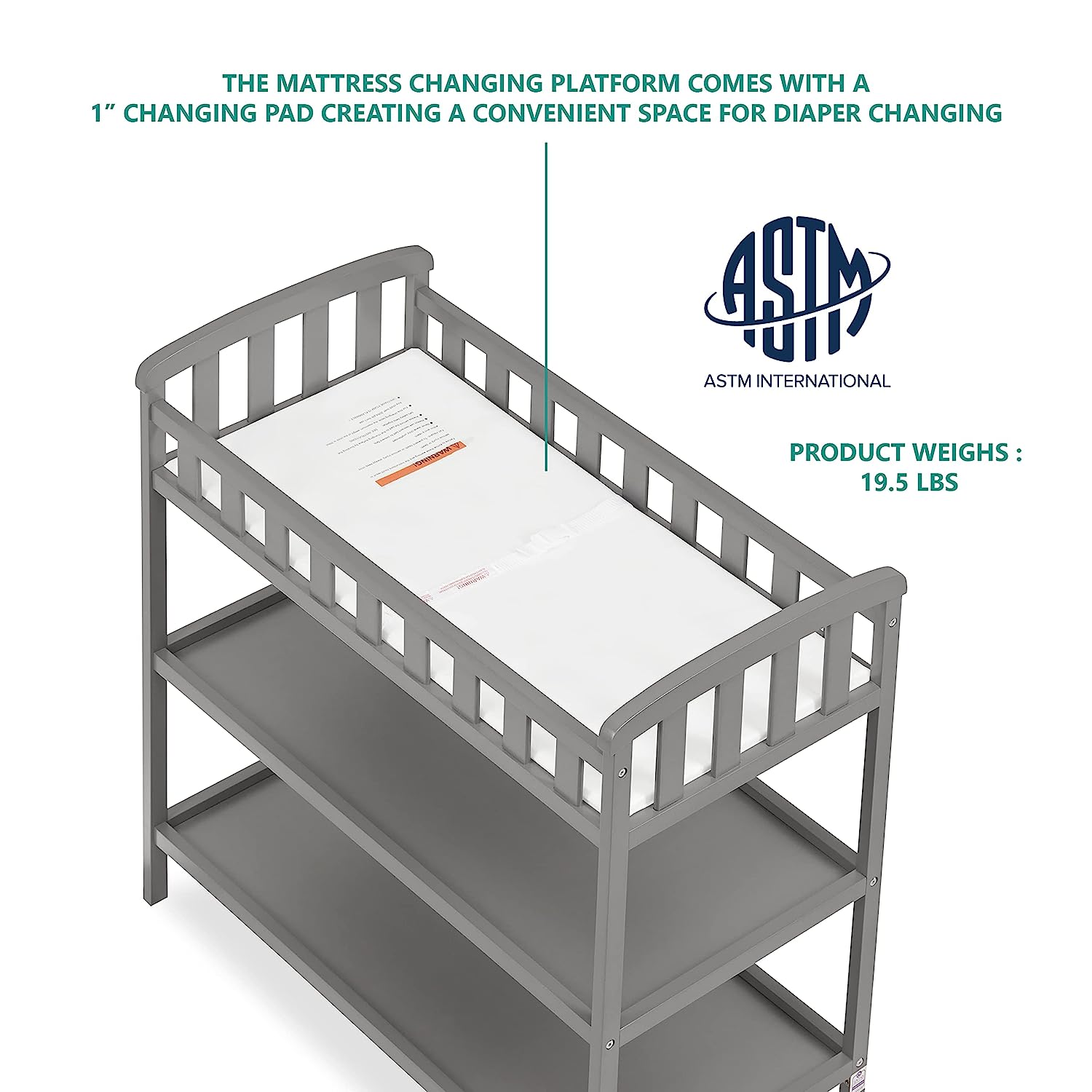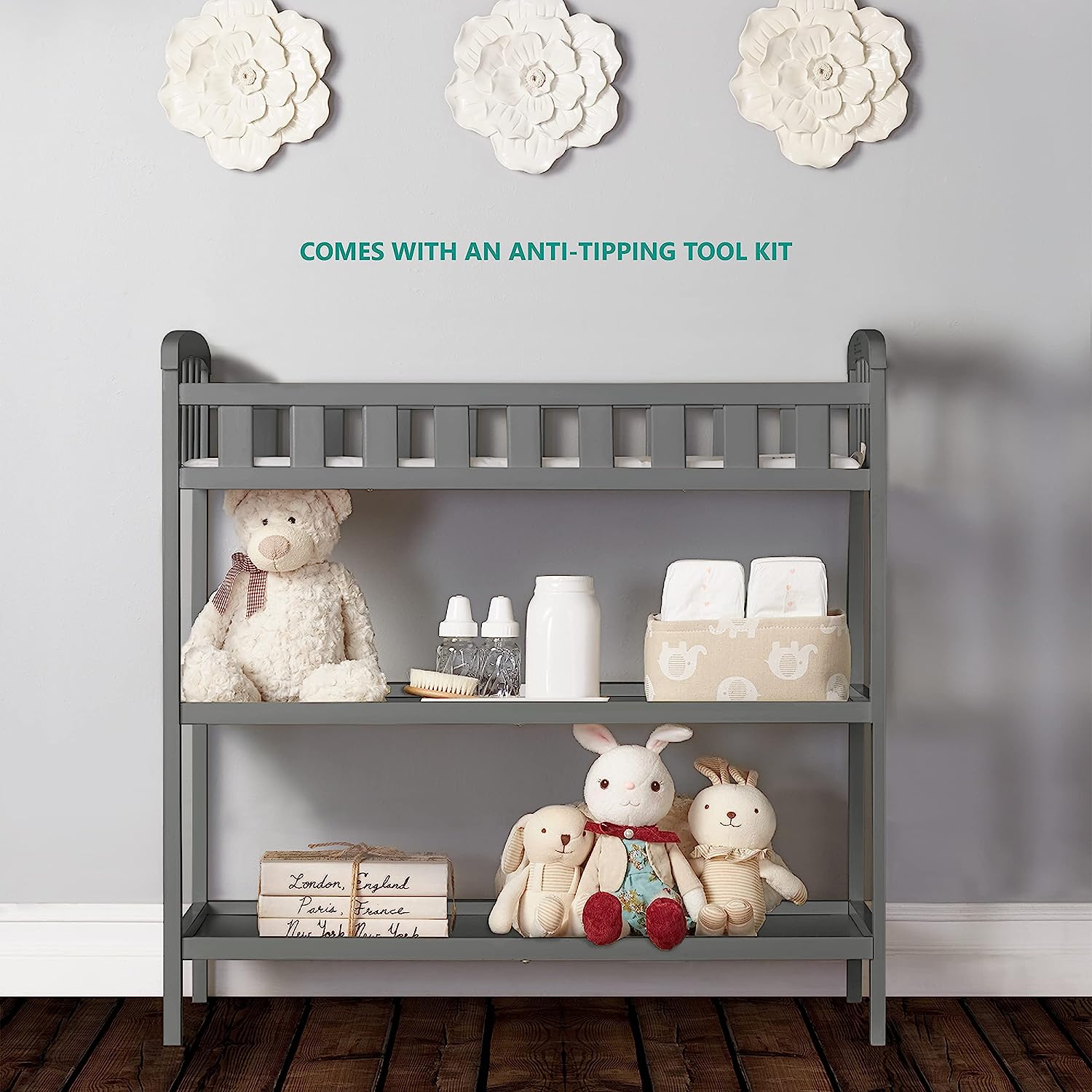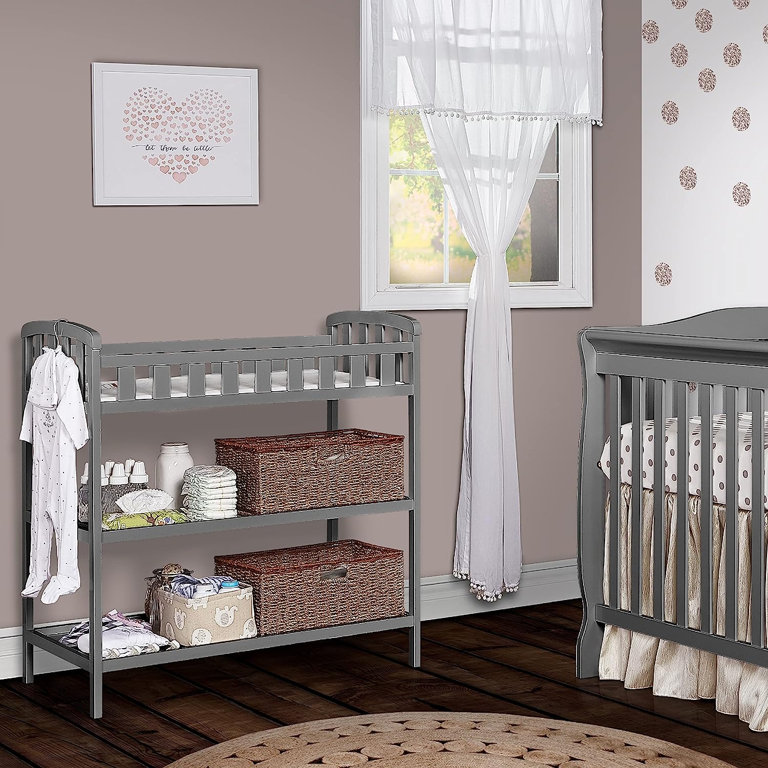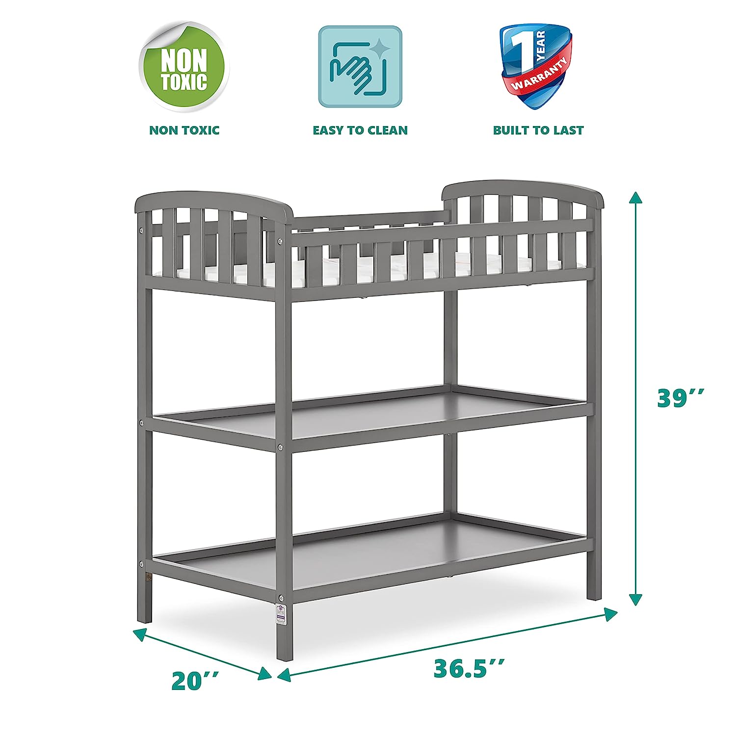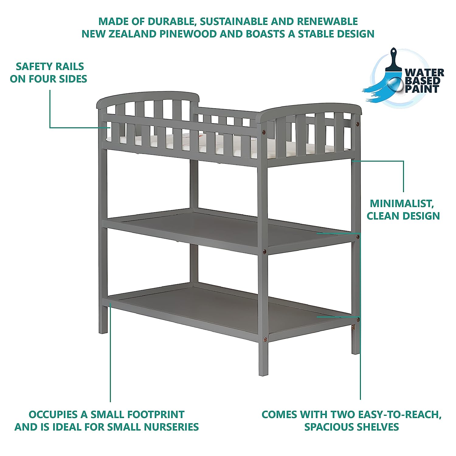 Dream On Me Emily Changing Table In Steel Grey. Comes With 1″ Changing Pad. Features Two Shelves. Portable Changing Station. Made Of Sustainable New Zealand Pinewood