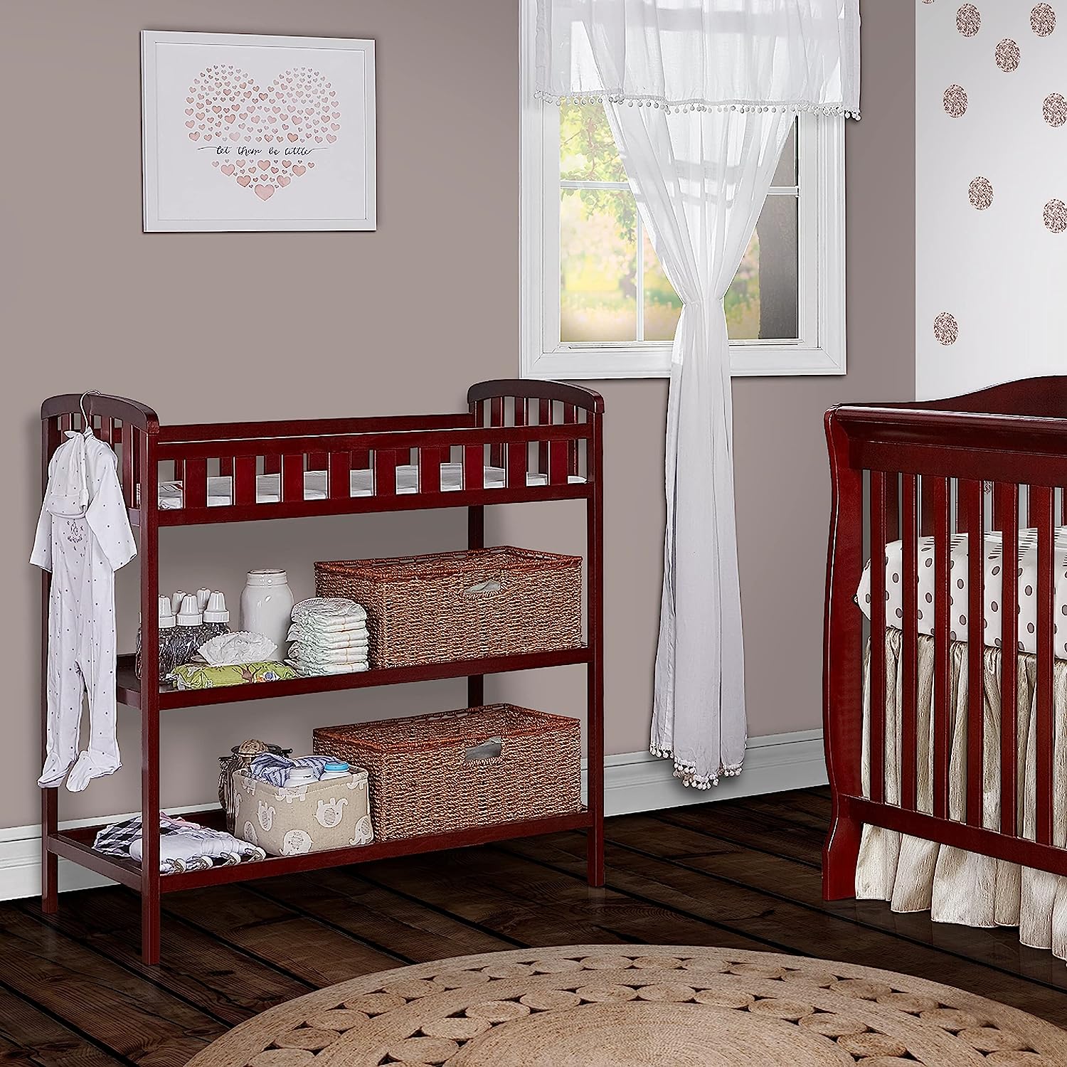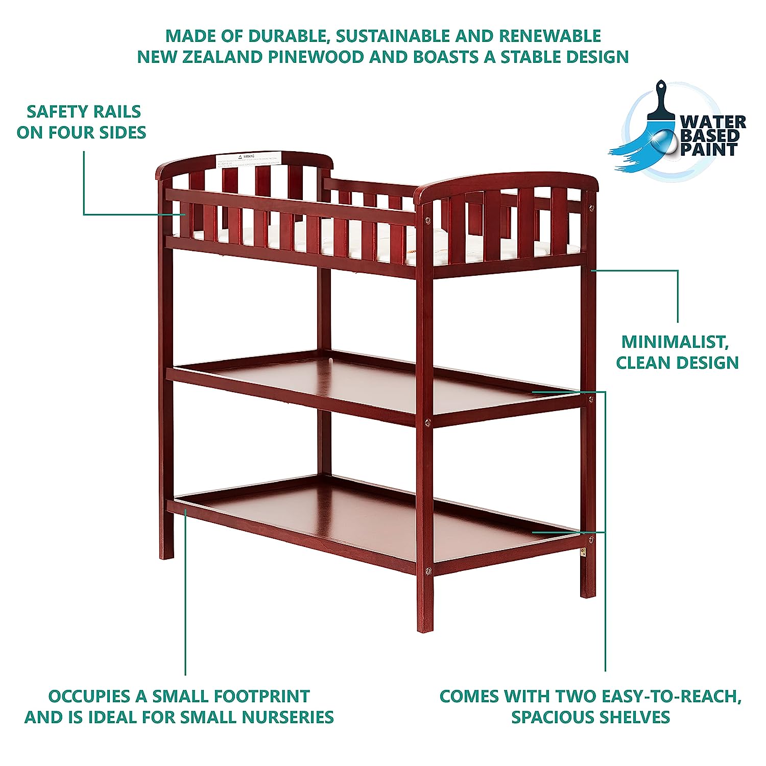 Dream On Me Emily Changing Table In Cherry. Comes With 1″ Changing Pad. Features Two Shelves. Portable Changing Station. Made Of Sustainable New Zealand Pinewood