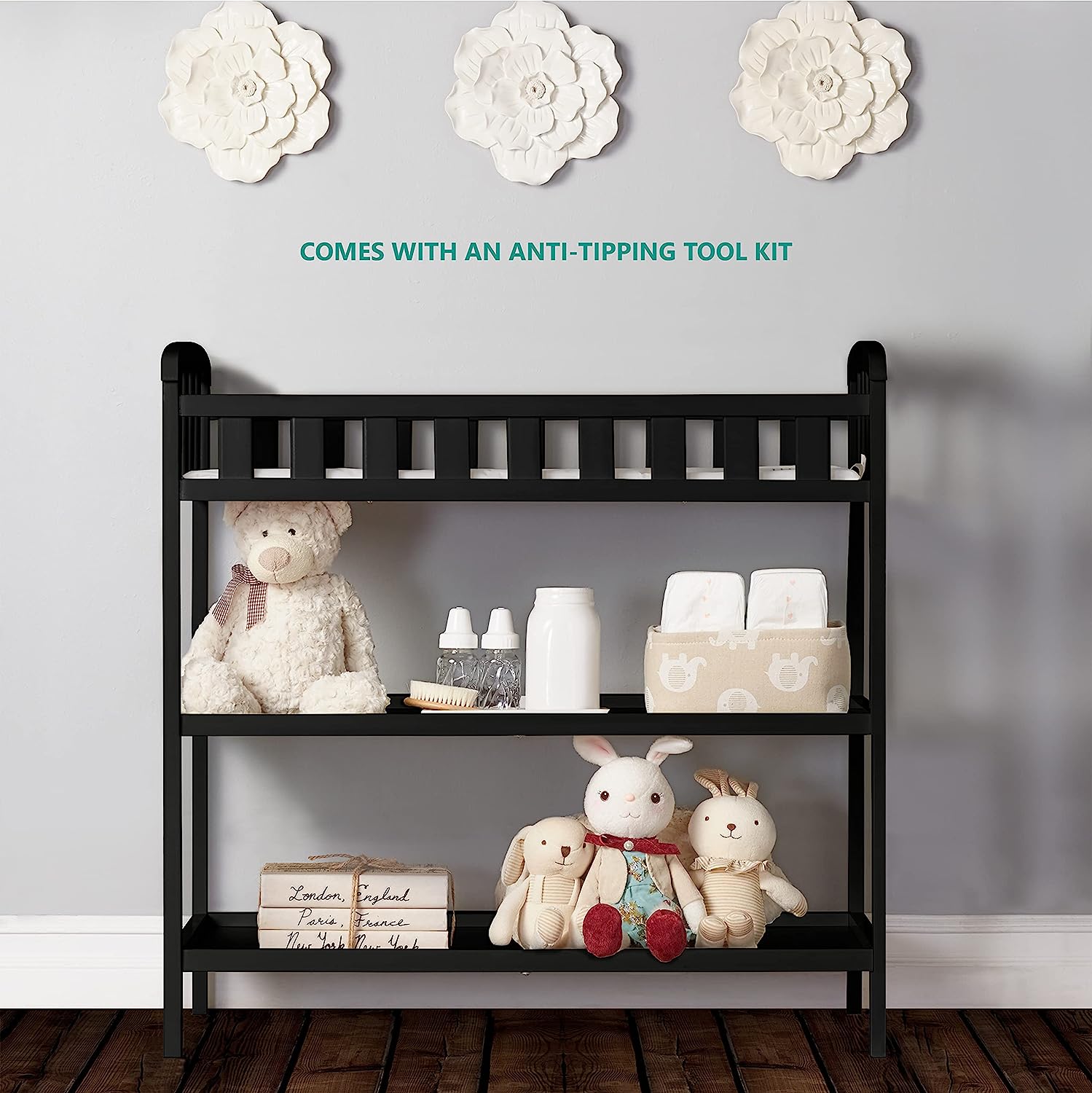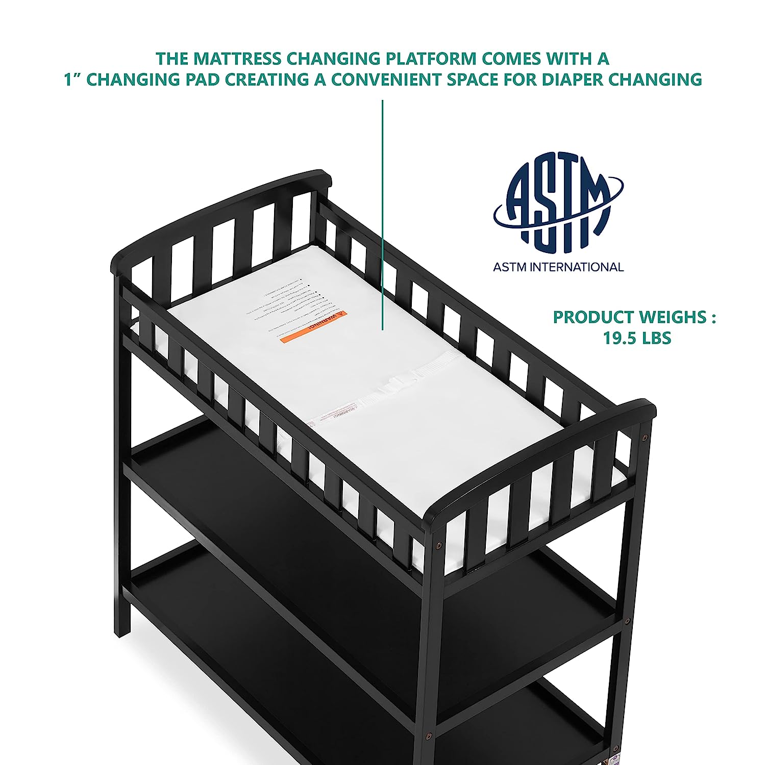 Dream On Me Emily Changing Table In Black. Comes With 1″ Changing Pad. Features Two Shelves. Portable Changing Station. Made Of Sustainable New Zealand Pinewood
