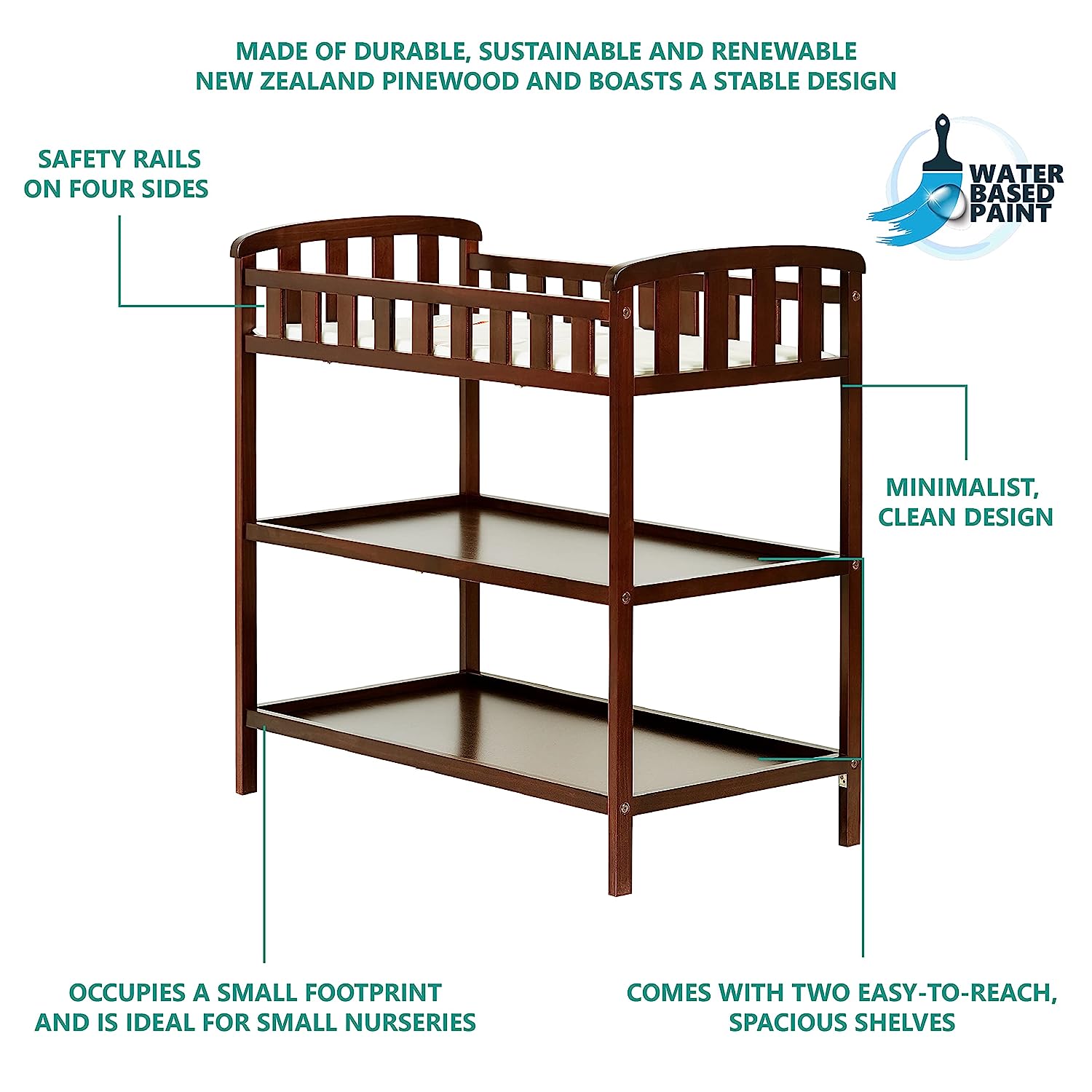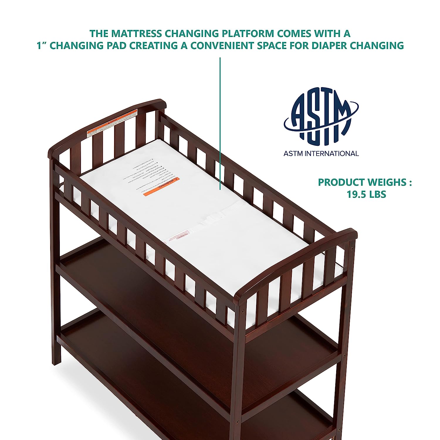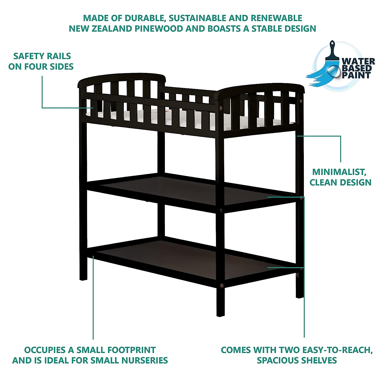 Dream On Me Emily Changing Table In Espresso. Comes With 1″ Changing Pad. Features Two Shelves. Portable Changing Station. Made Of Sustainable New Zealand Pinewood