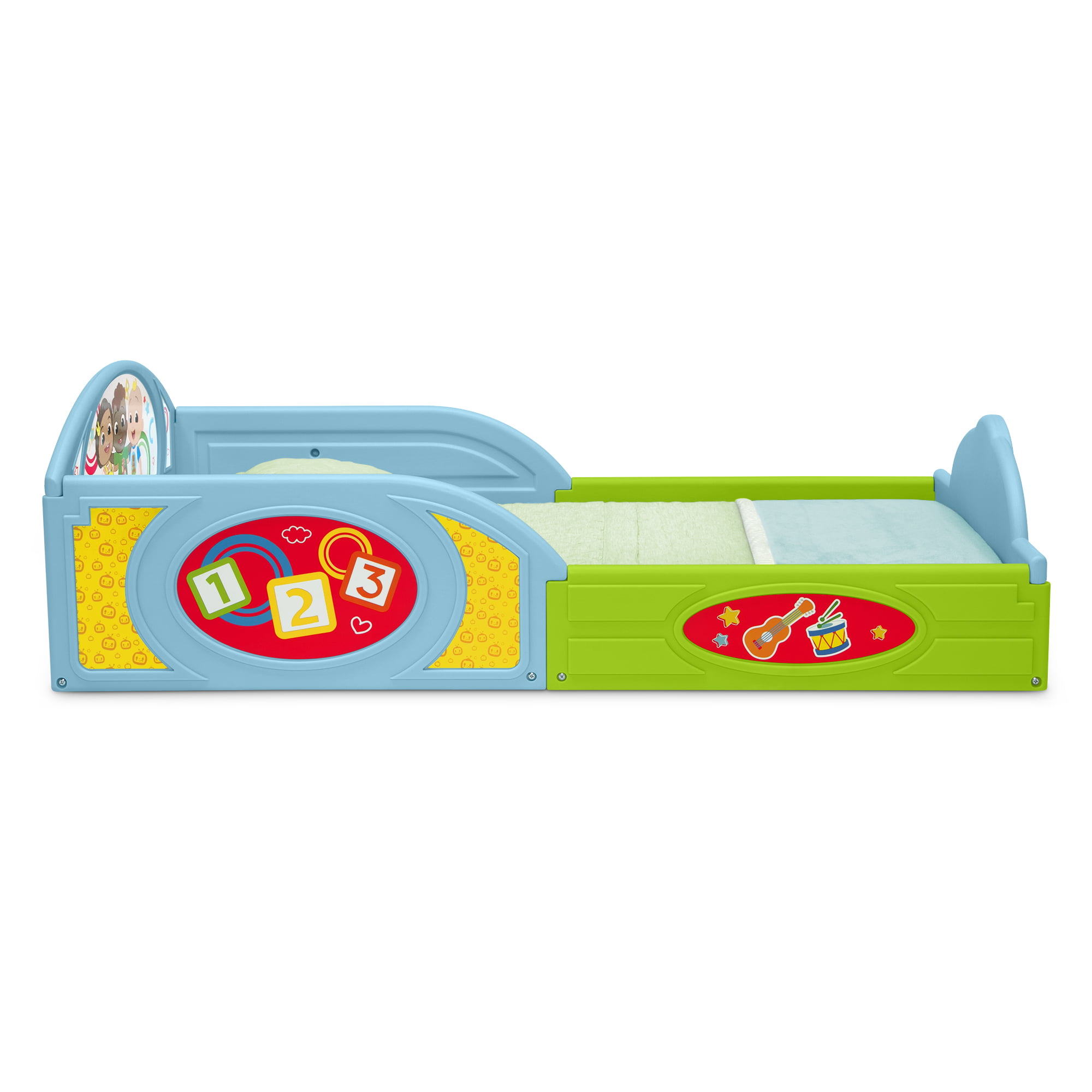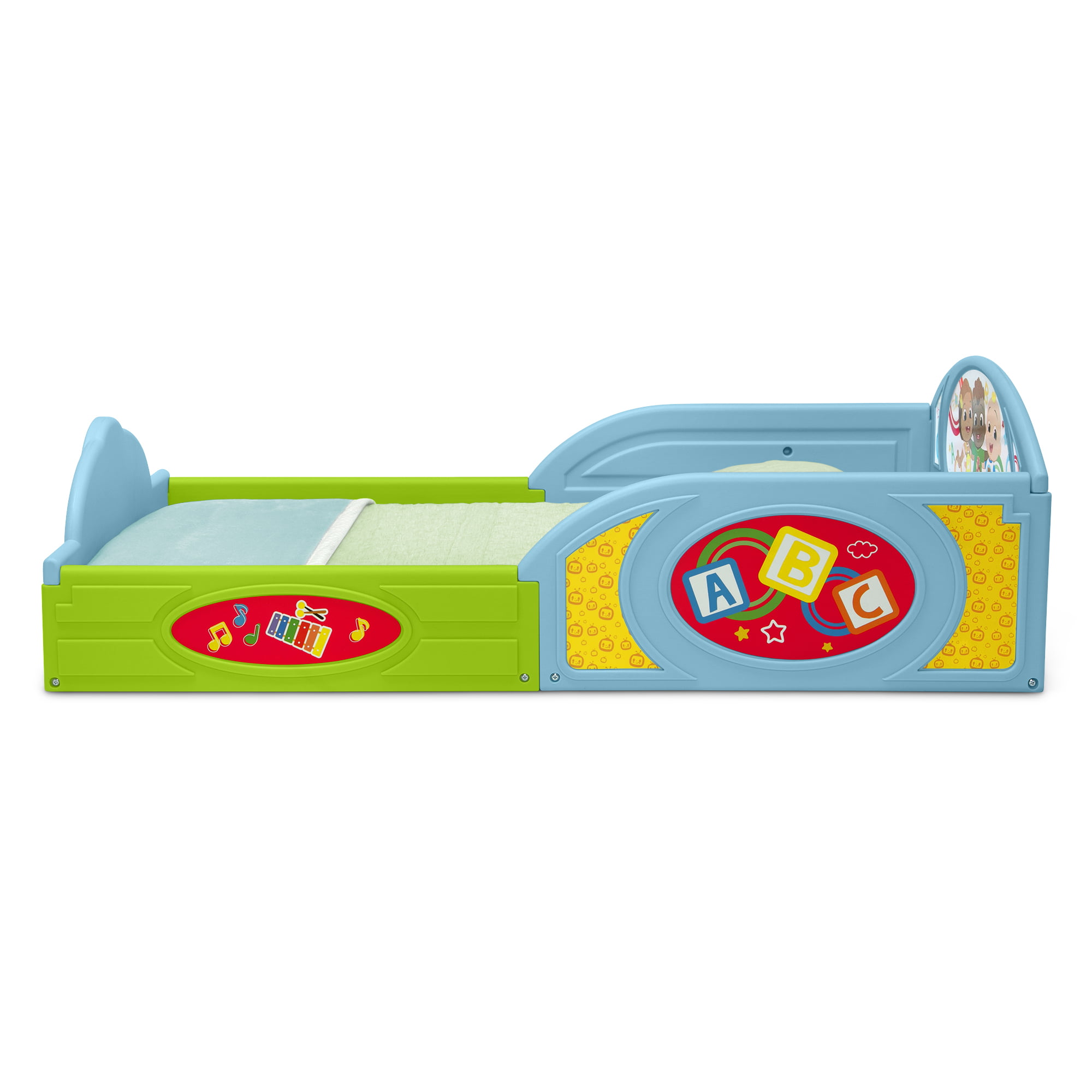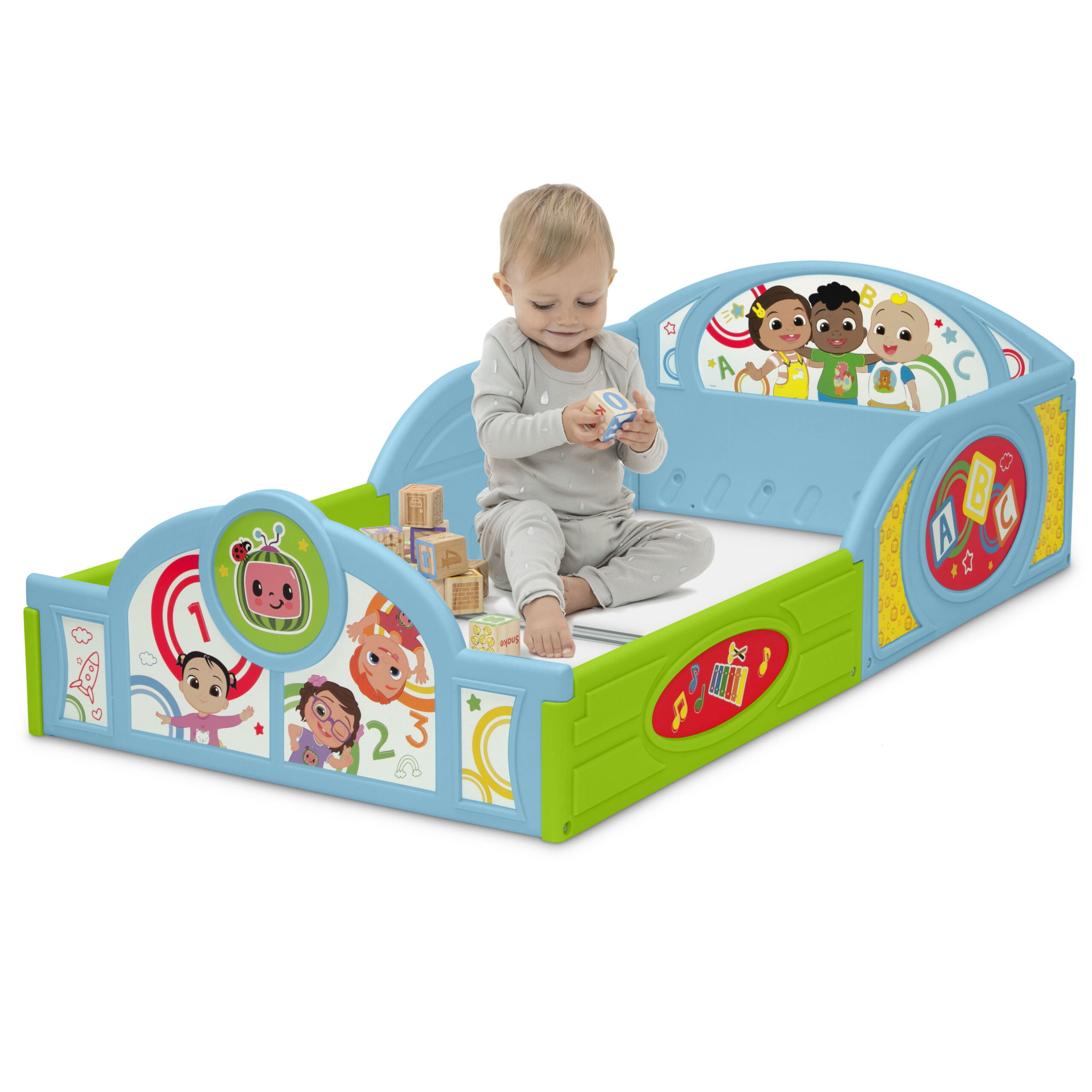 CoComelon Sleep and Play Toddler Bed with Built-In Guardrails by Delta Children. Blue/Multi
