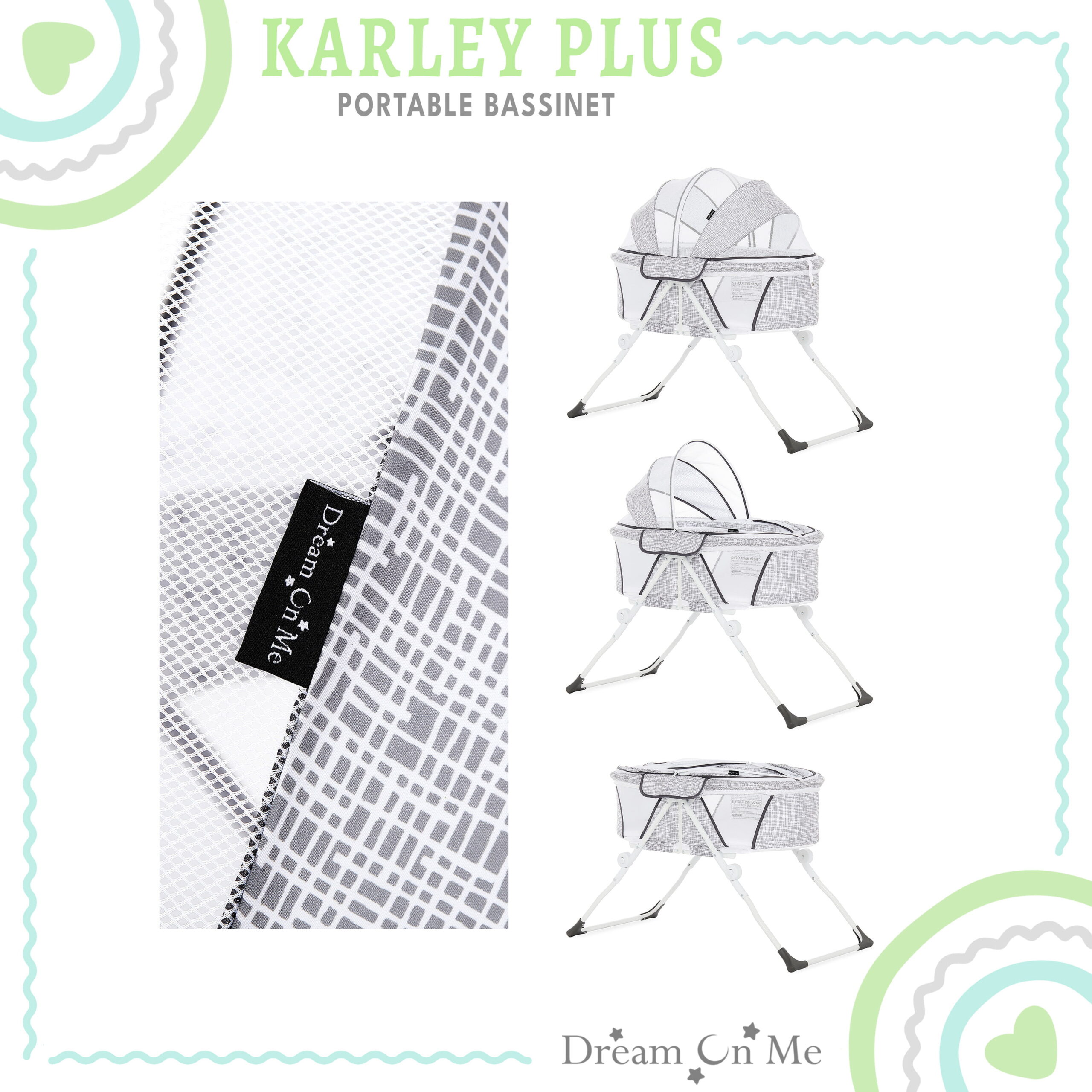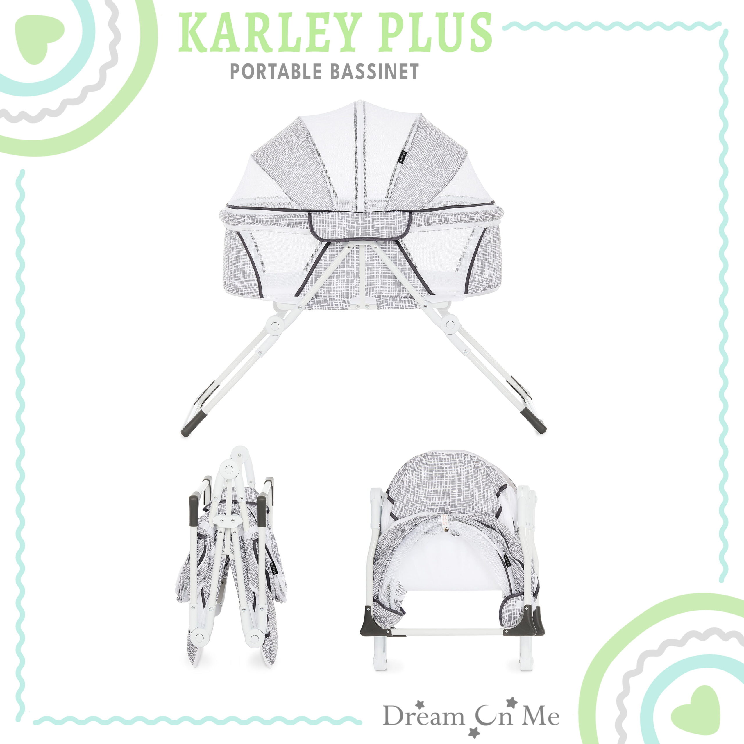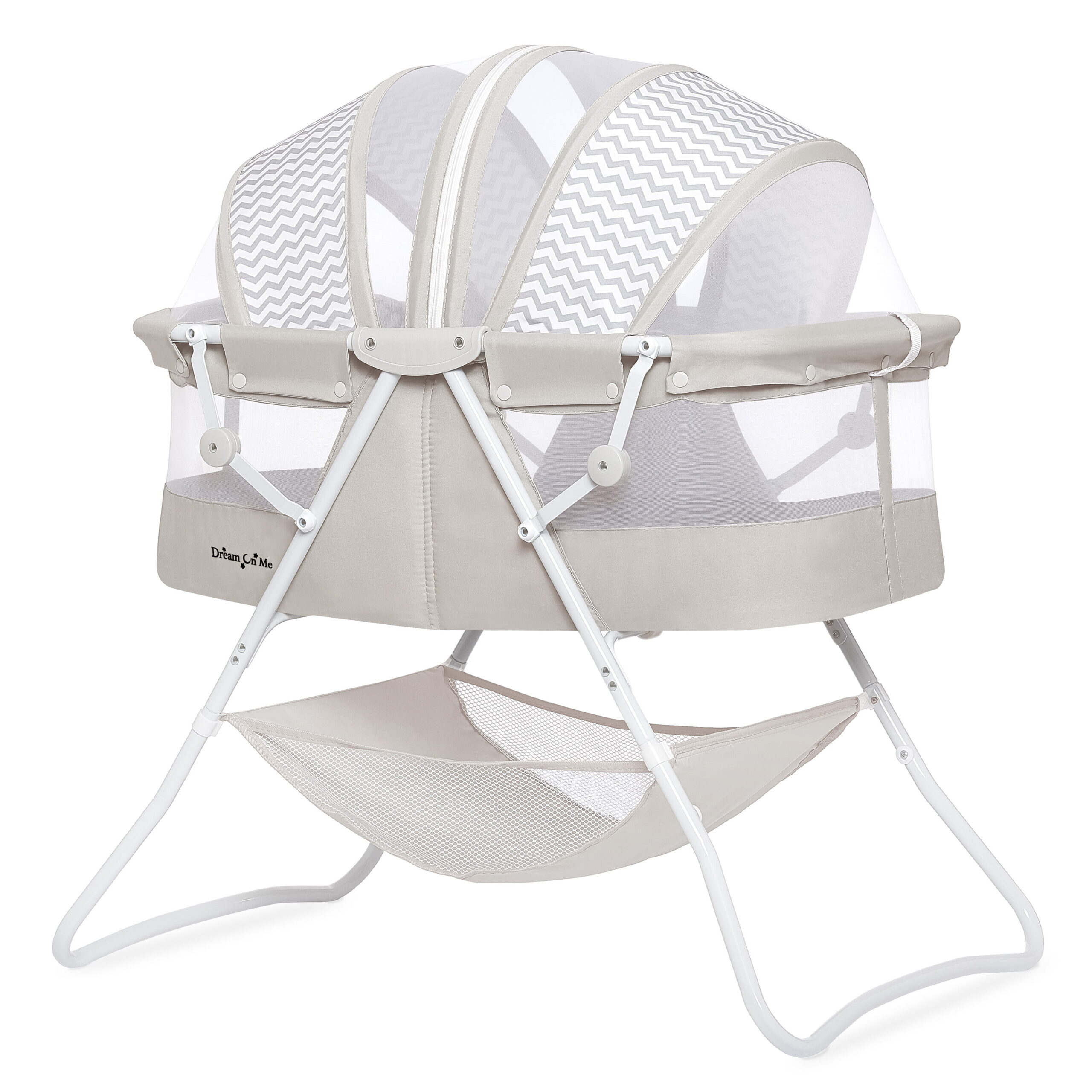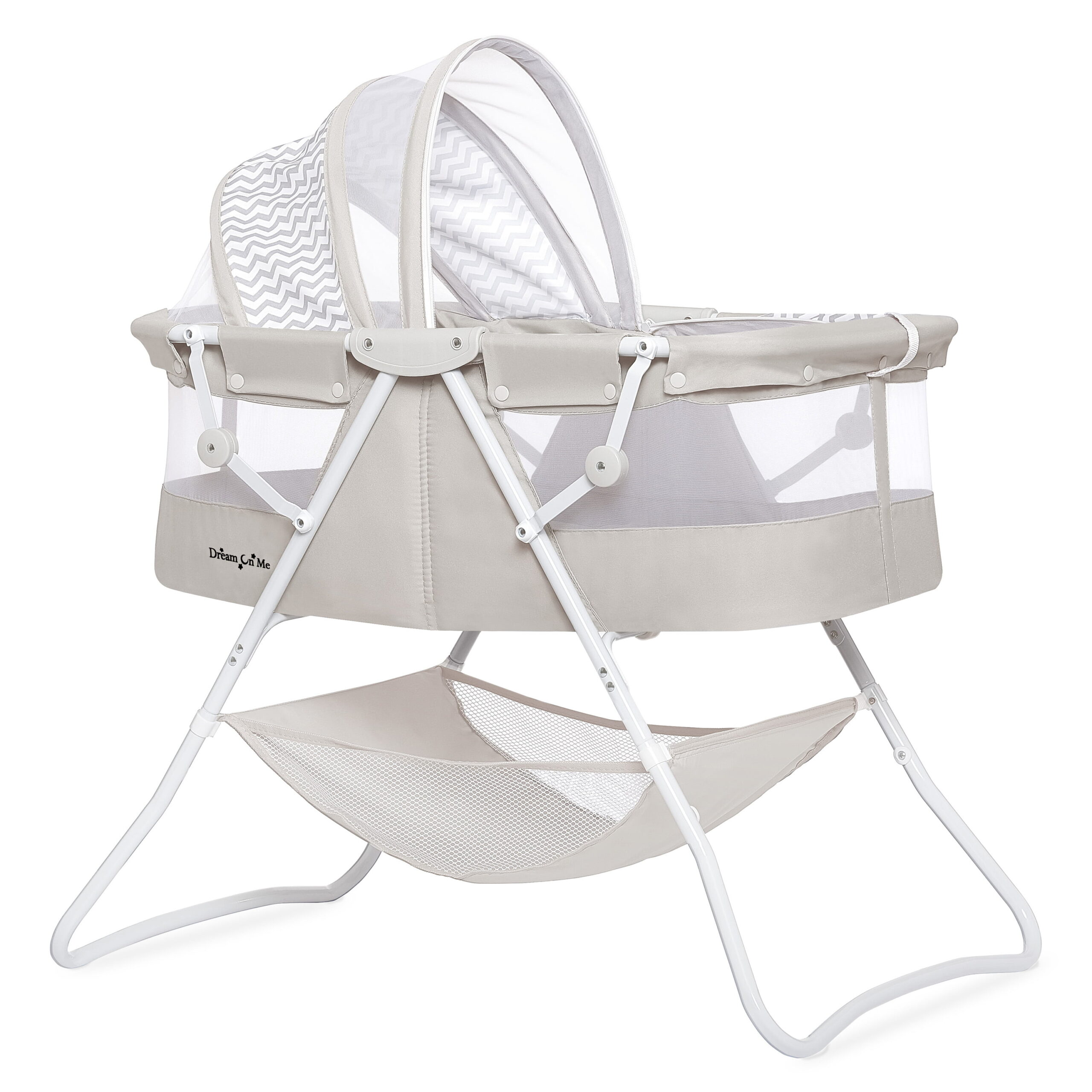 Dream On Me Karley Bassinet in Grey. Quick Fold and Easy to Carry. Large Storage Basket