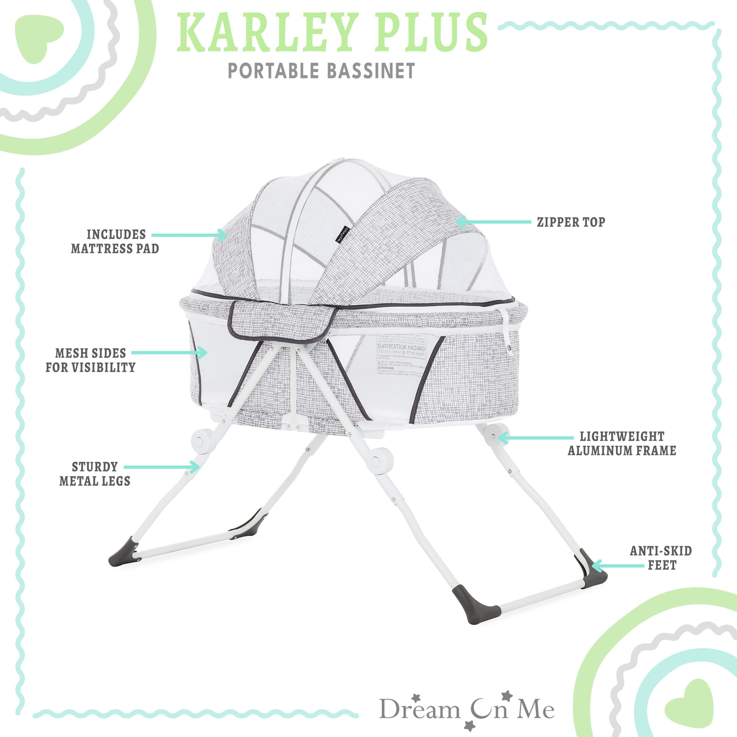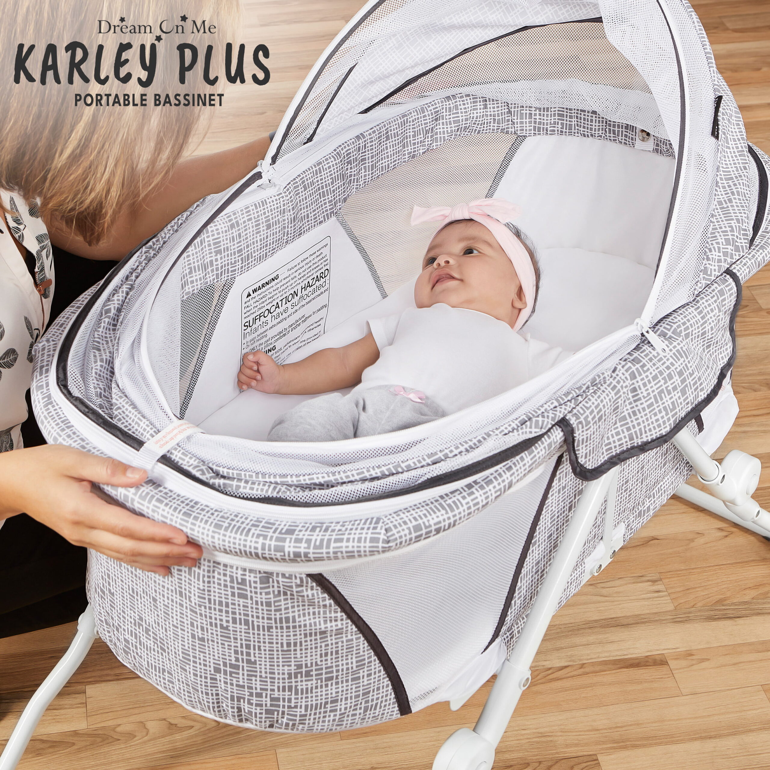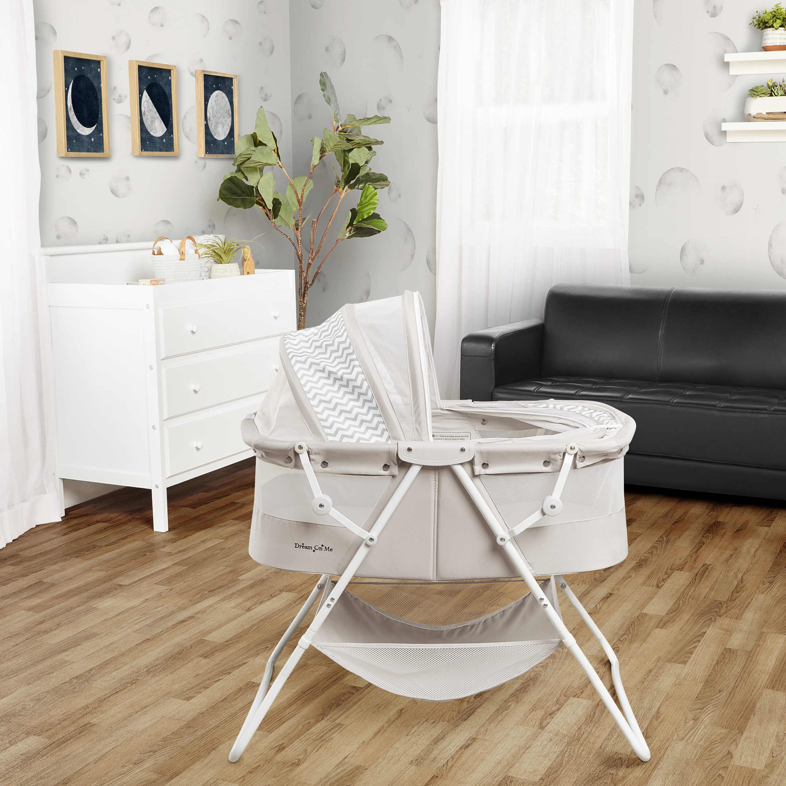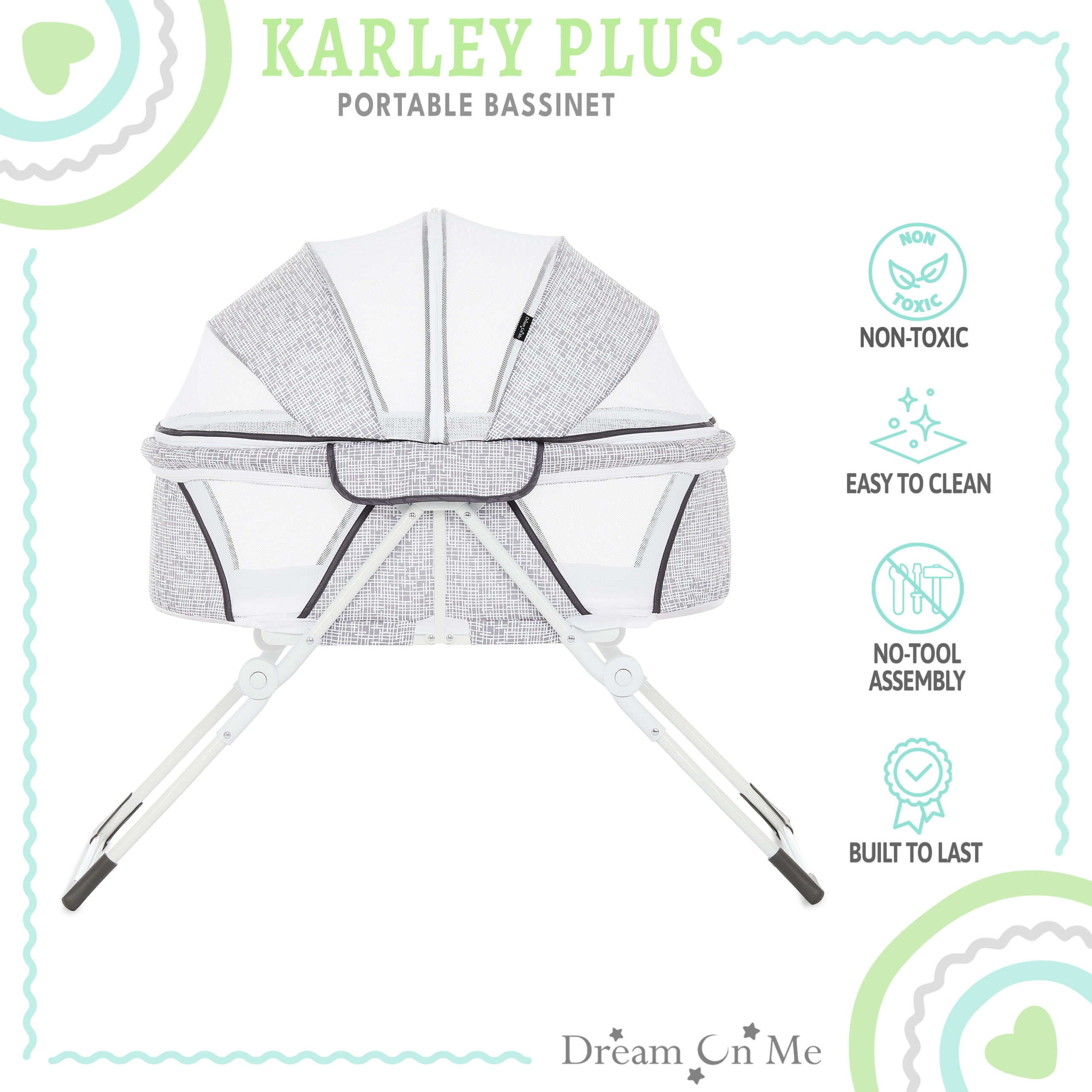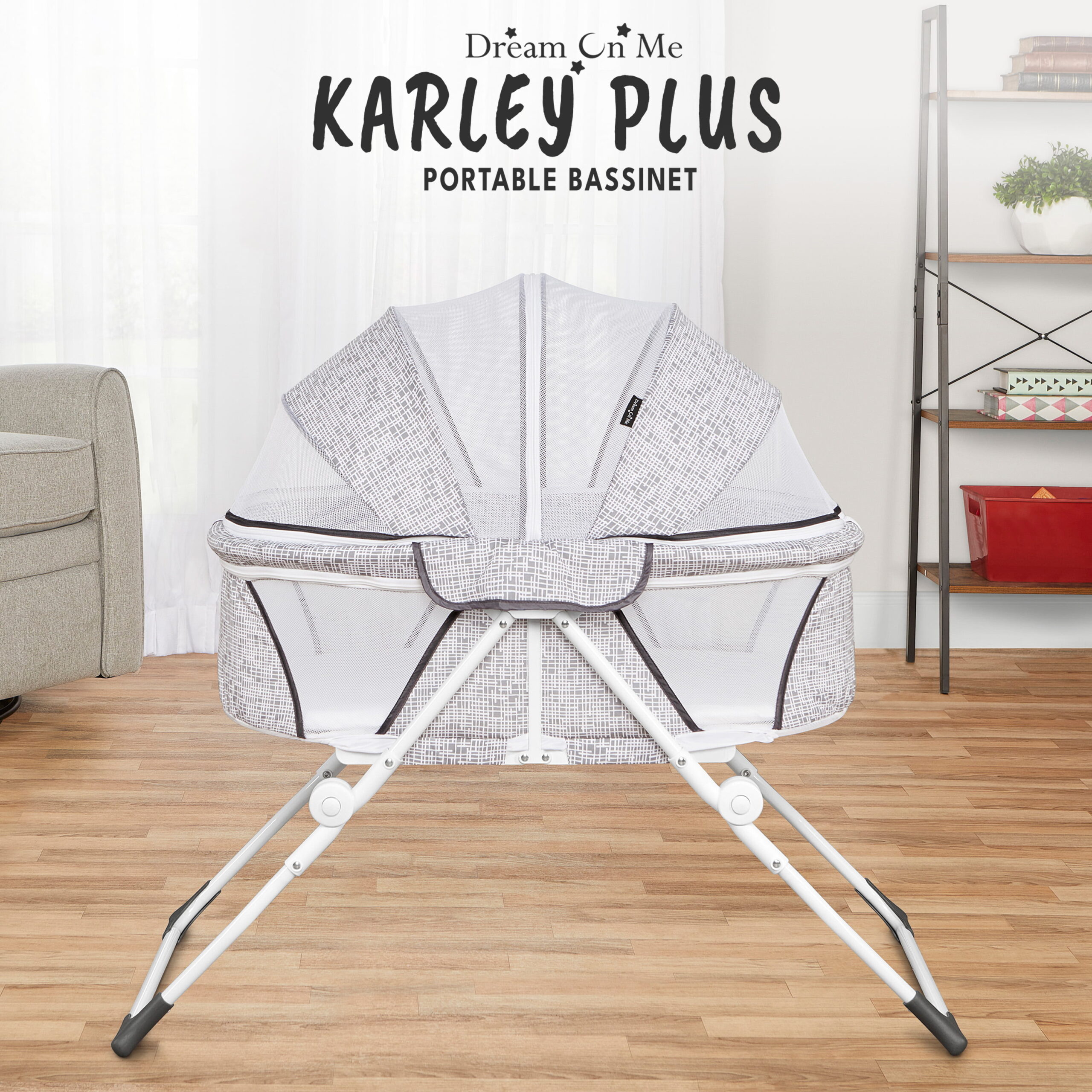 Dream On Me Karley Bassinet in Grey. Quick Fold and Easy to Carry. Large Storage Basket