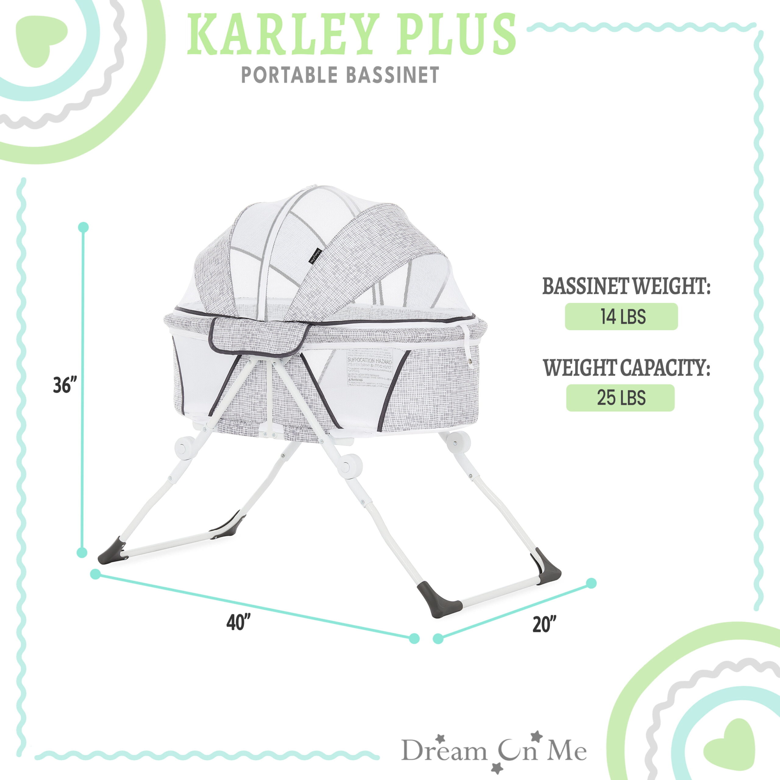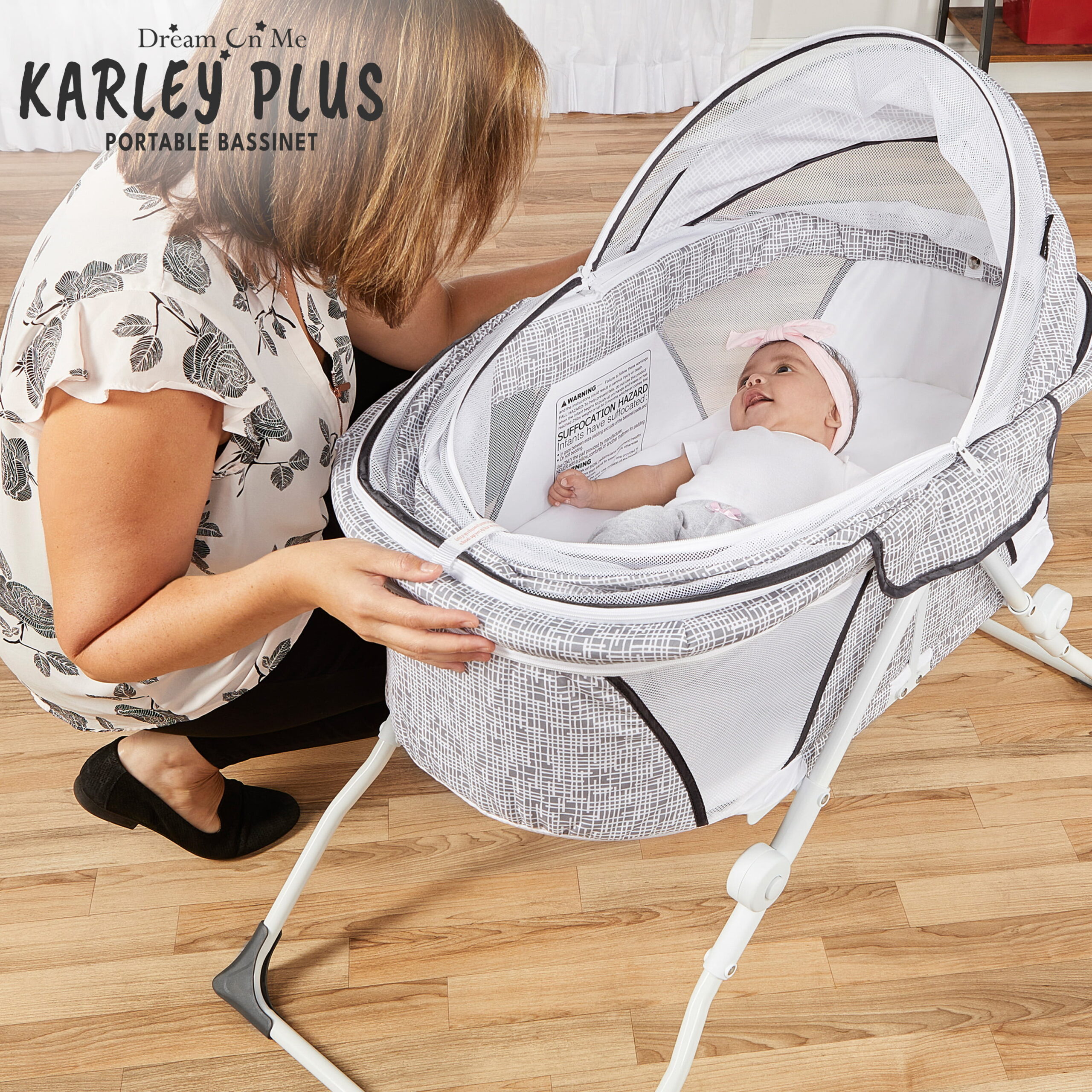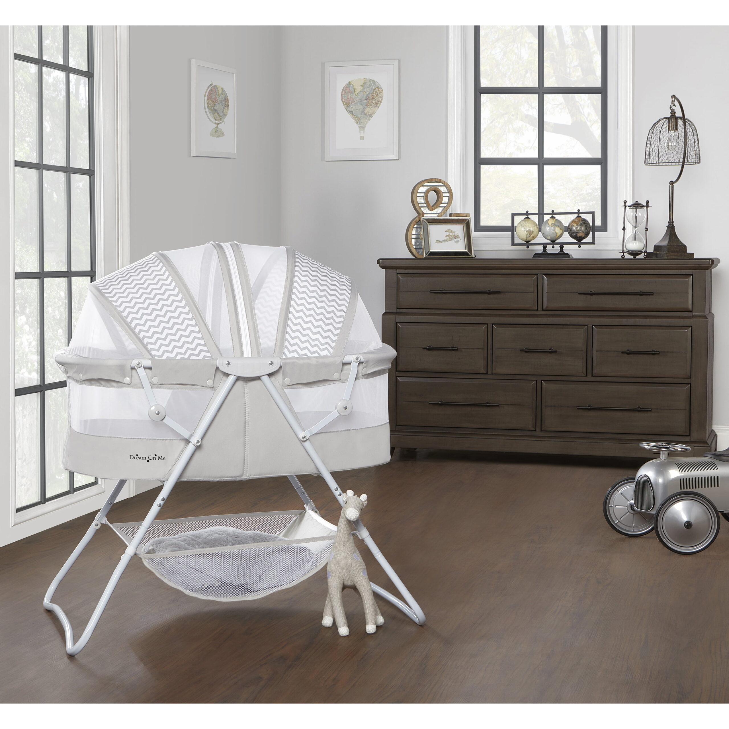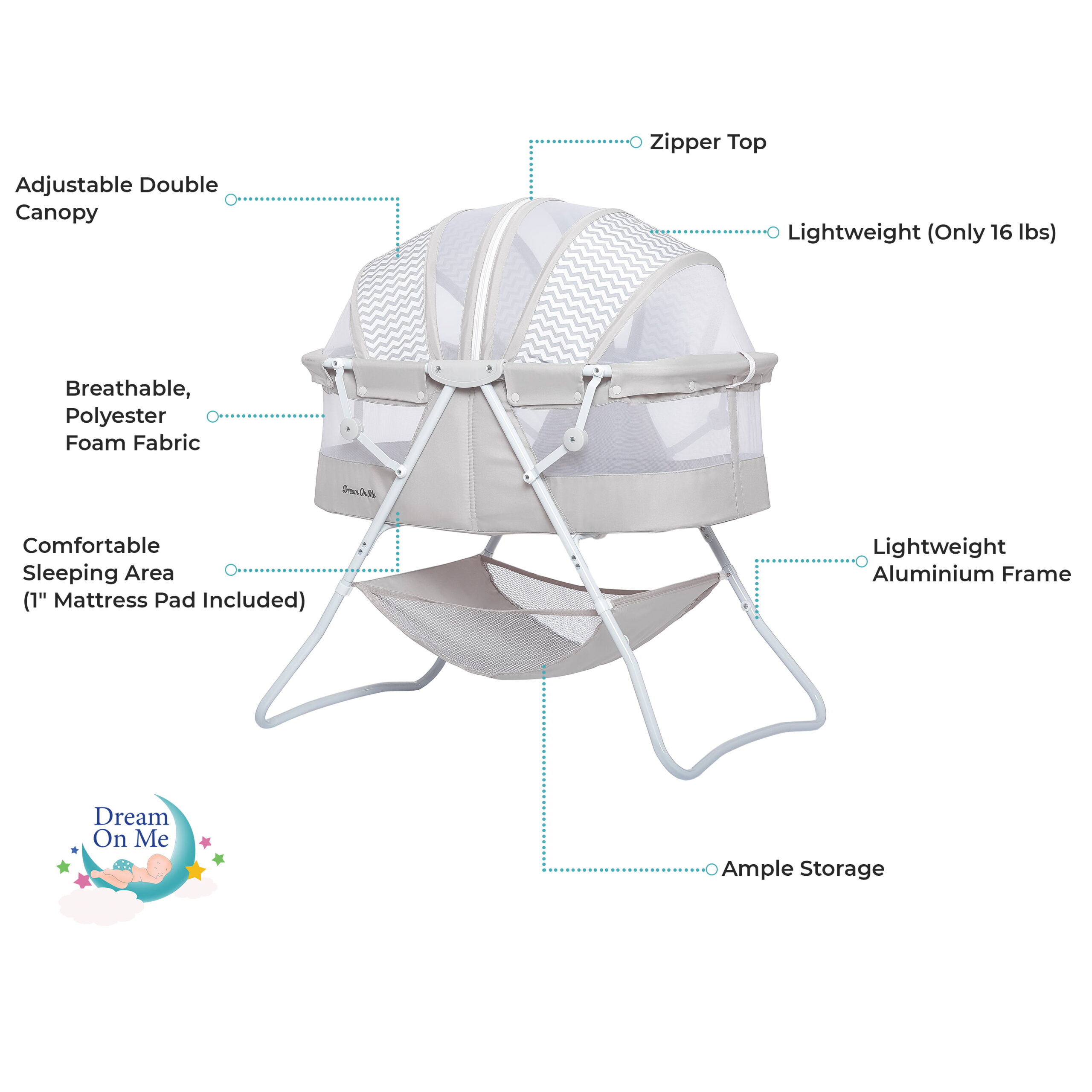 Dream On Me Karley Bassinet in Grey. Quick Fold and Easy to Carry. Large Storage Basket