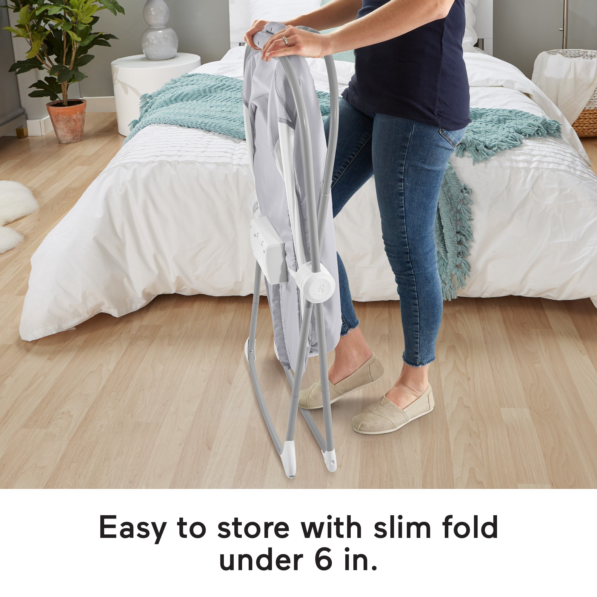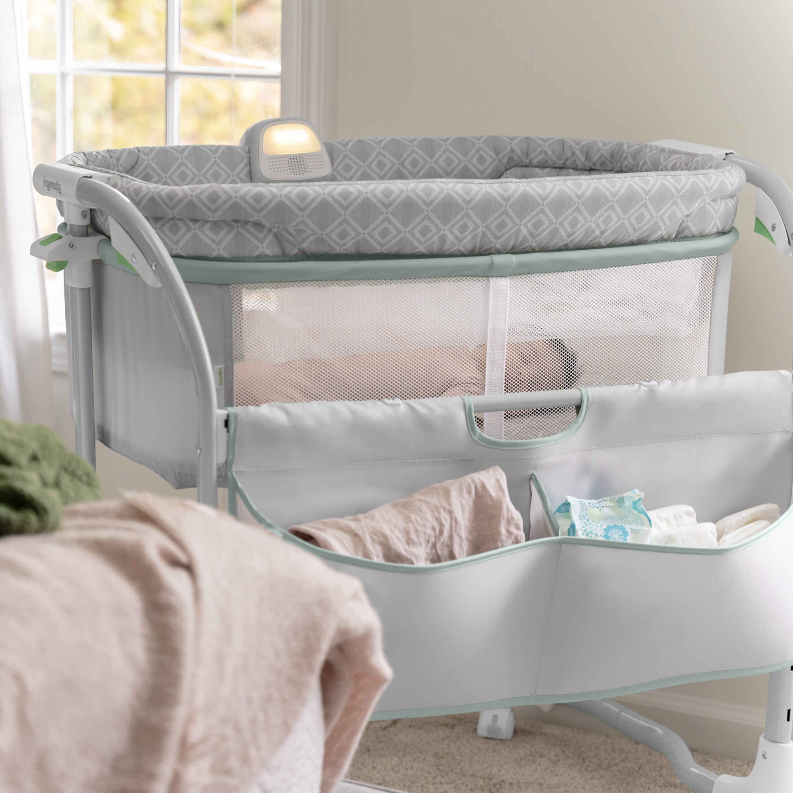 Ingenuity Dream & Grow Bedside Adjustable Baby Bassinet with Storage Pocket. Green/Gray