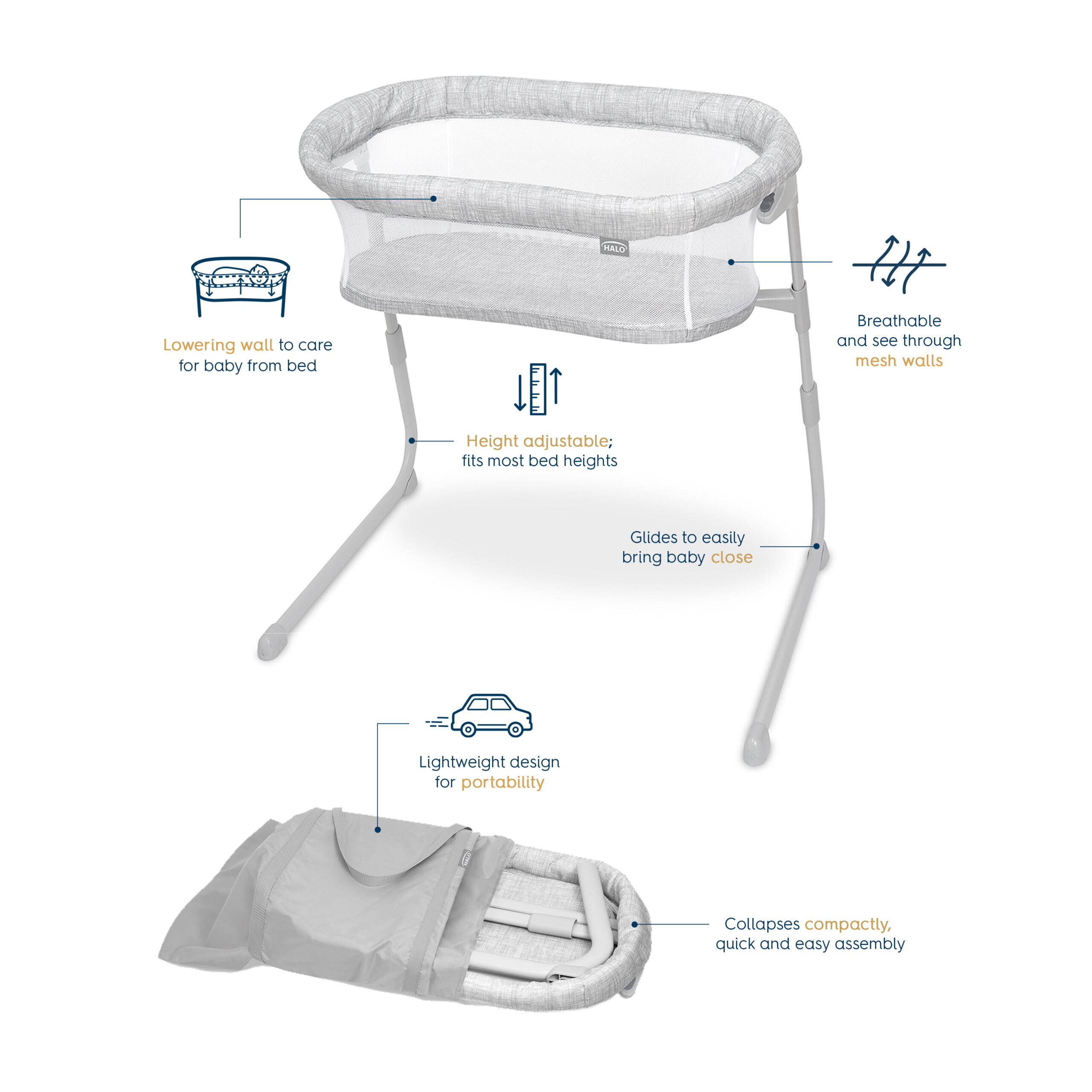 Halo® Bassinest® Flex™ - Portable Baby Bassinet - Newborn - 0-5 Months - Heather Weave