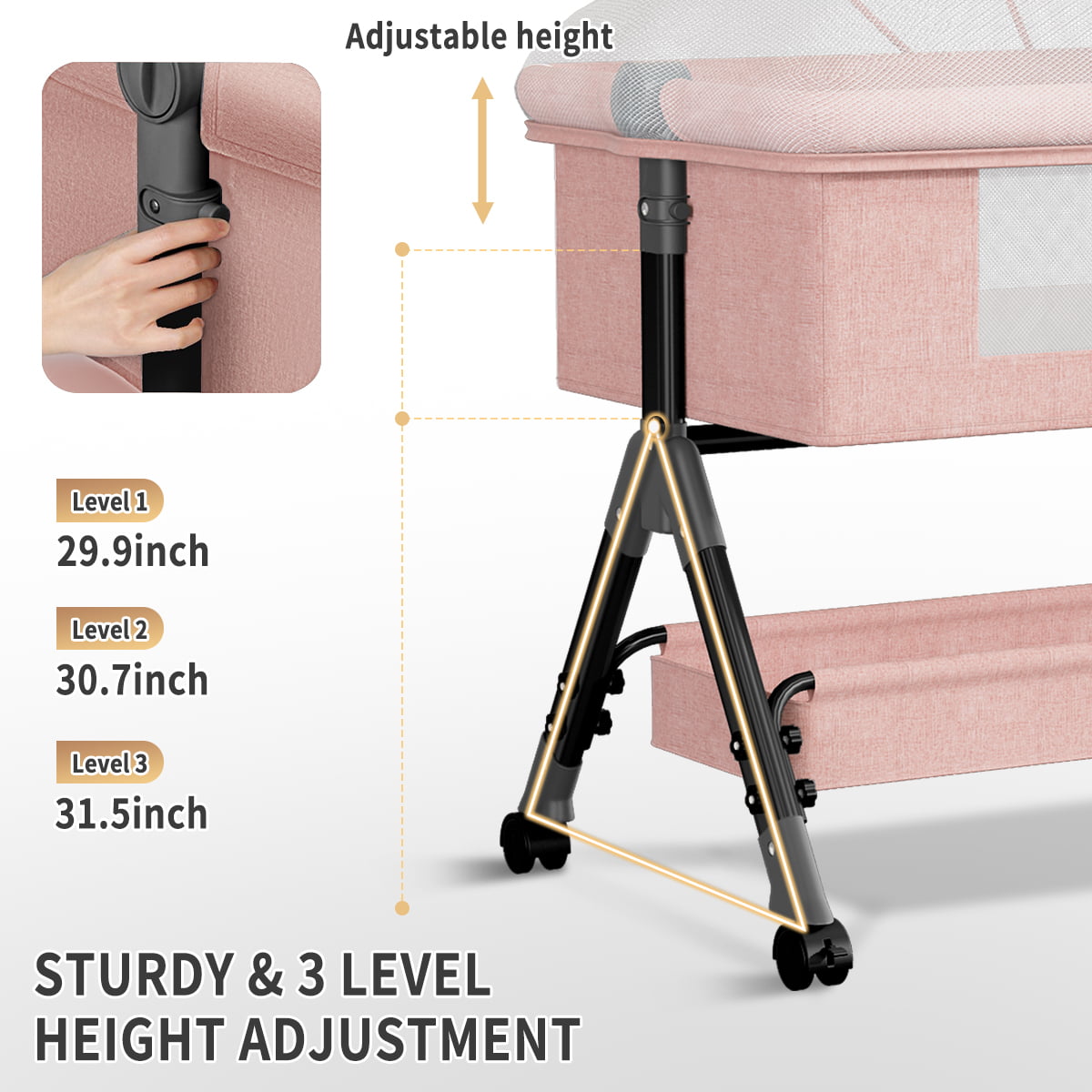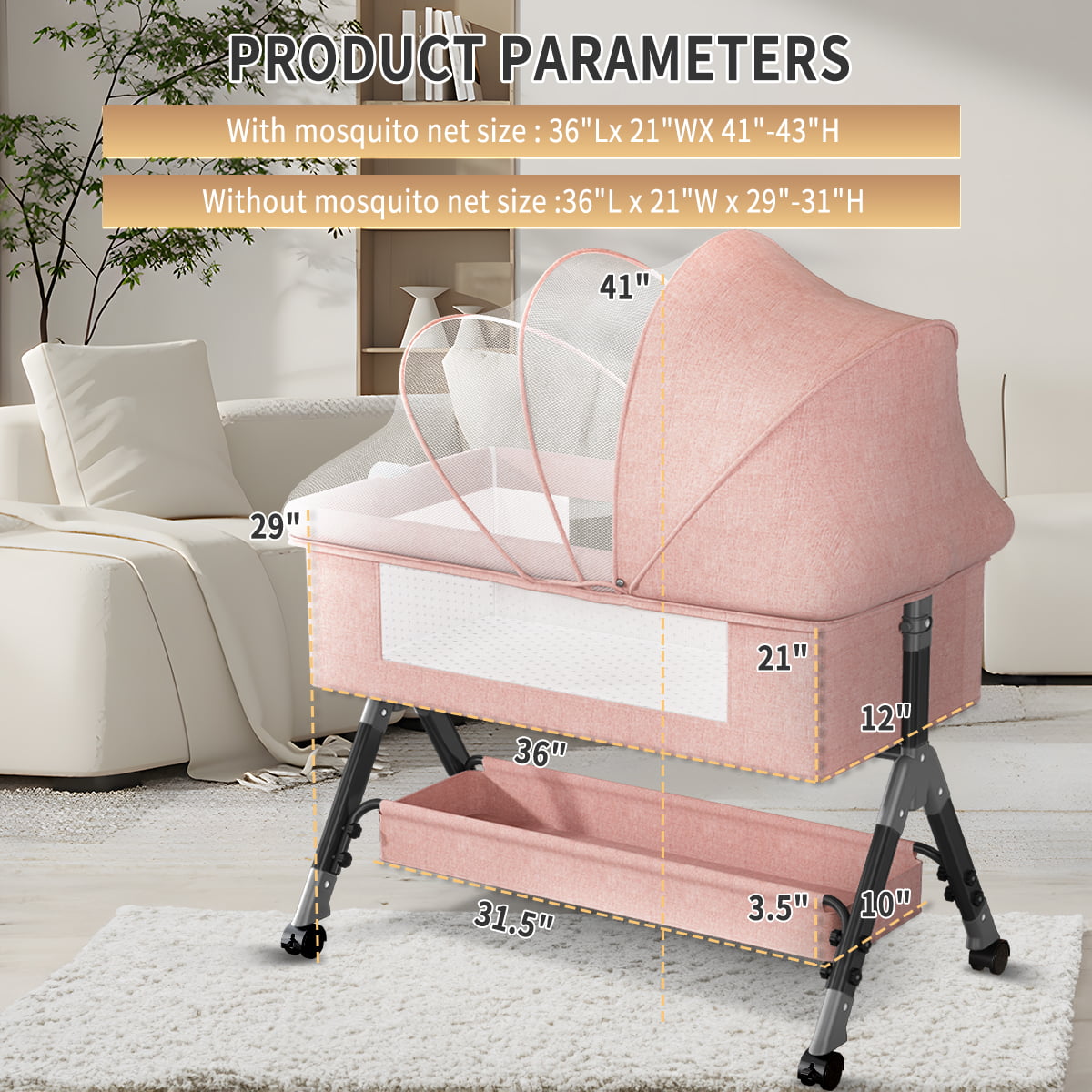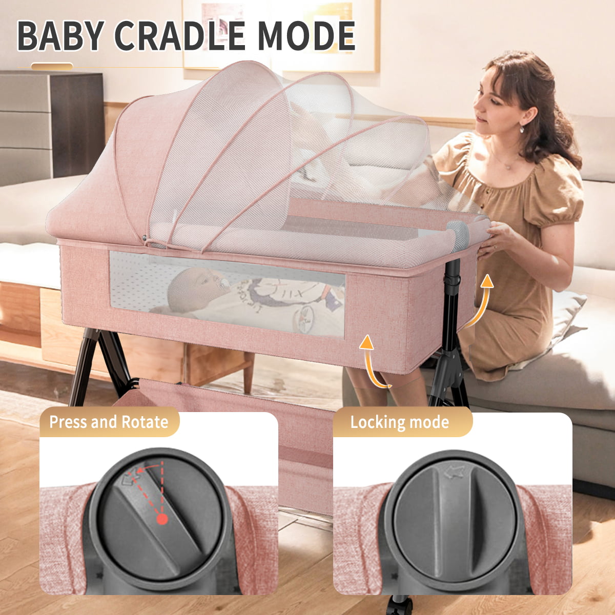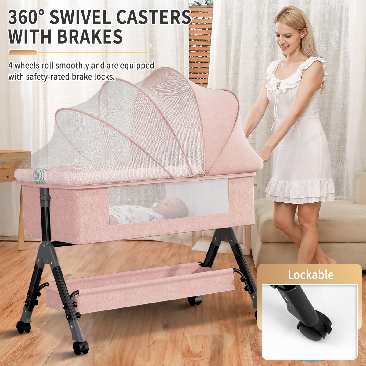 Baby Bassinet. Adjustable Baby Bedside Sleeper Bassinet with 360°Wheel. Baby Cradle for Infant.Newborn.Pink