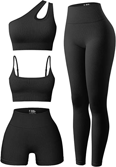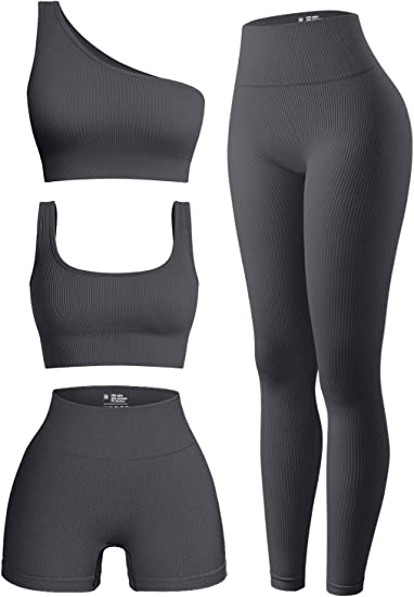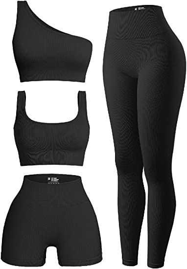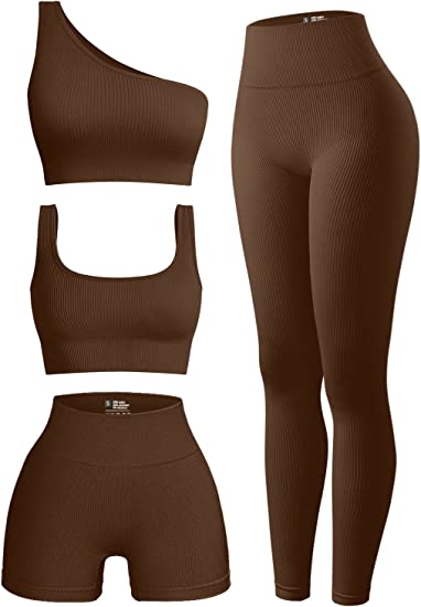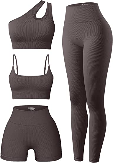OQQ Women's 3 Piece Medium Support Crop Top Seamless Ribbed Removable Cups Workout Yoga Sport Bra. Black Coffee Beige