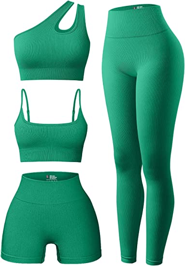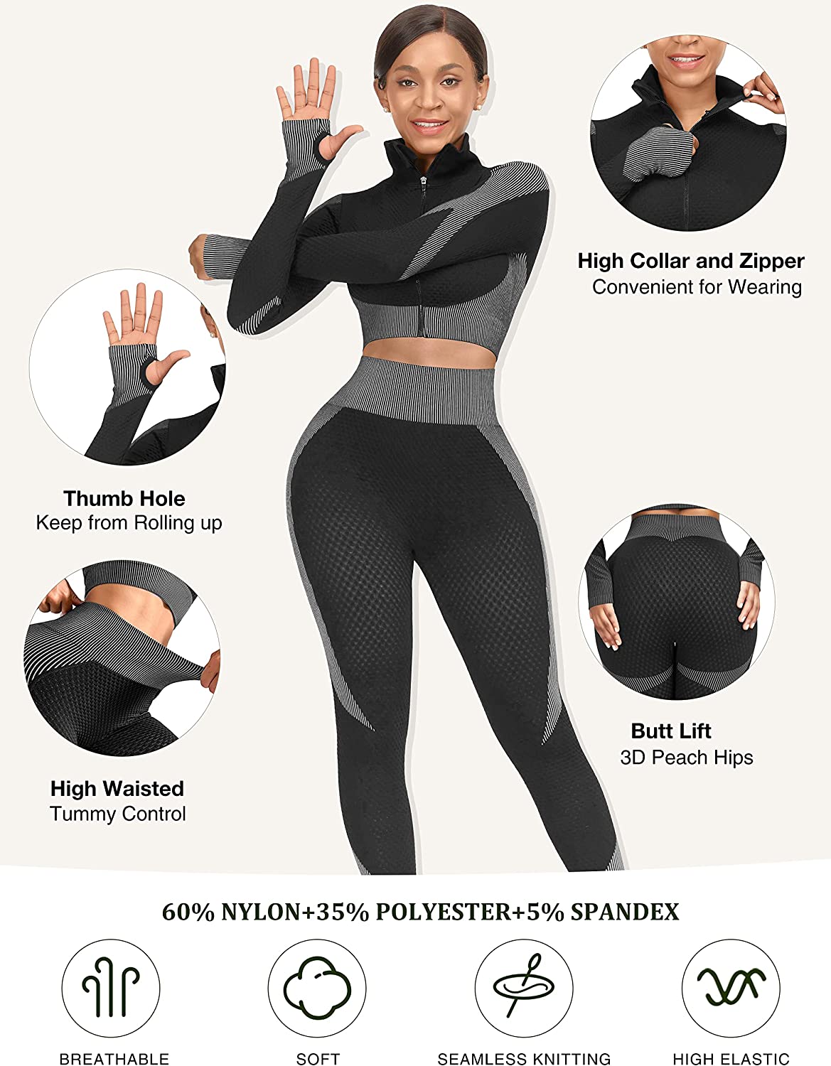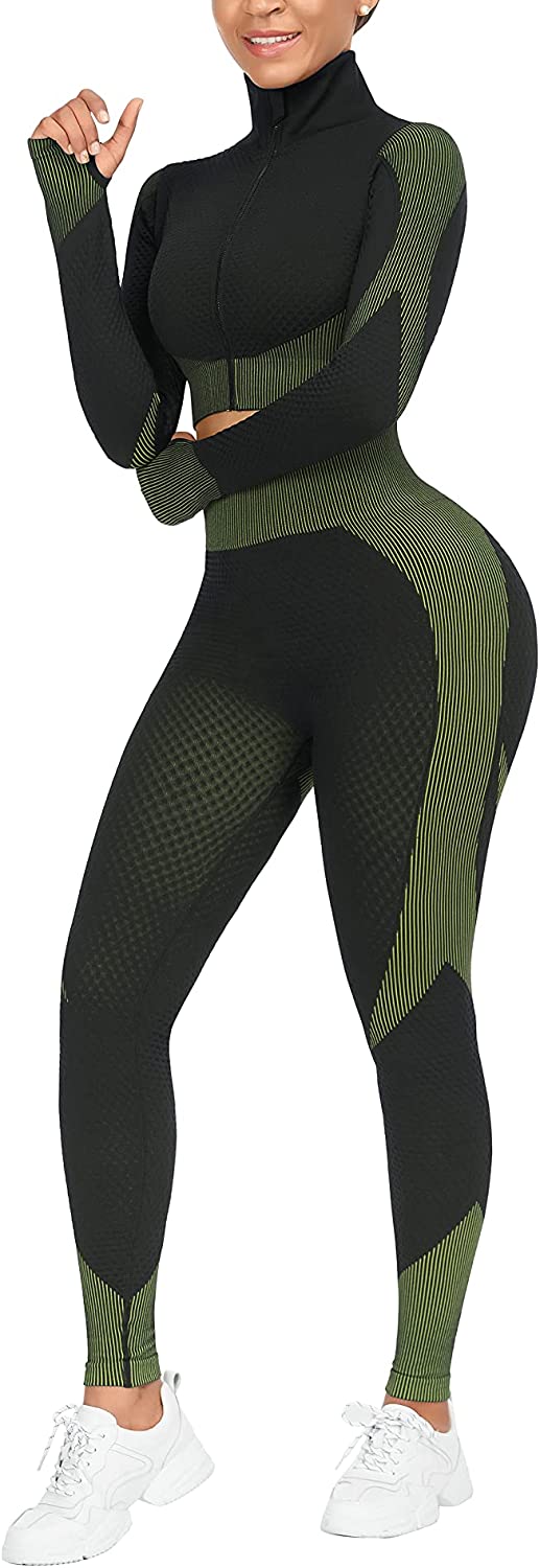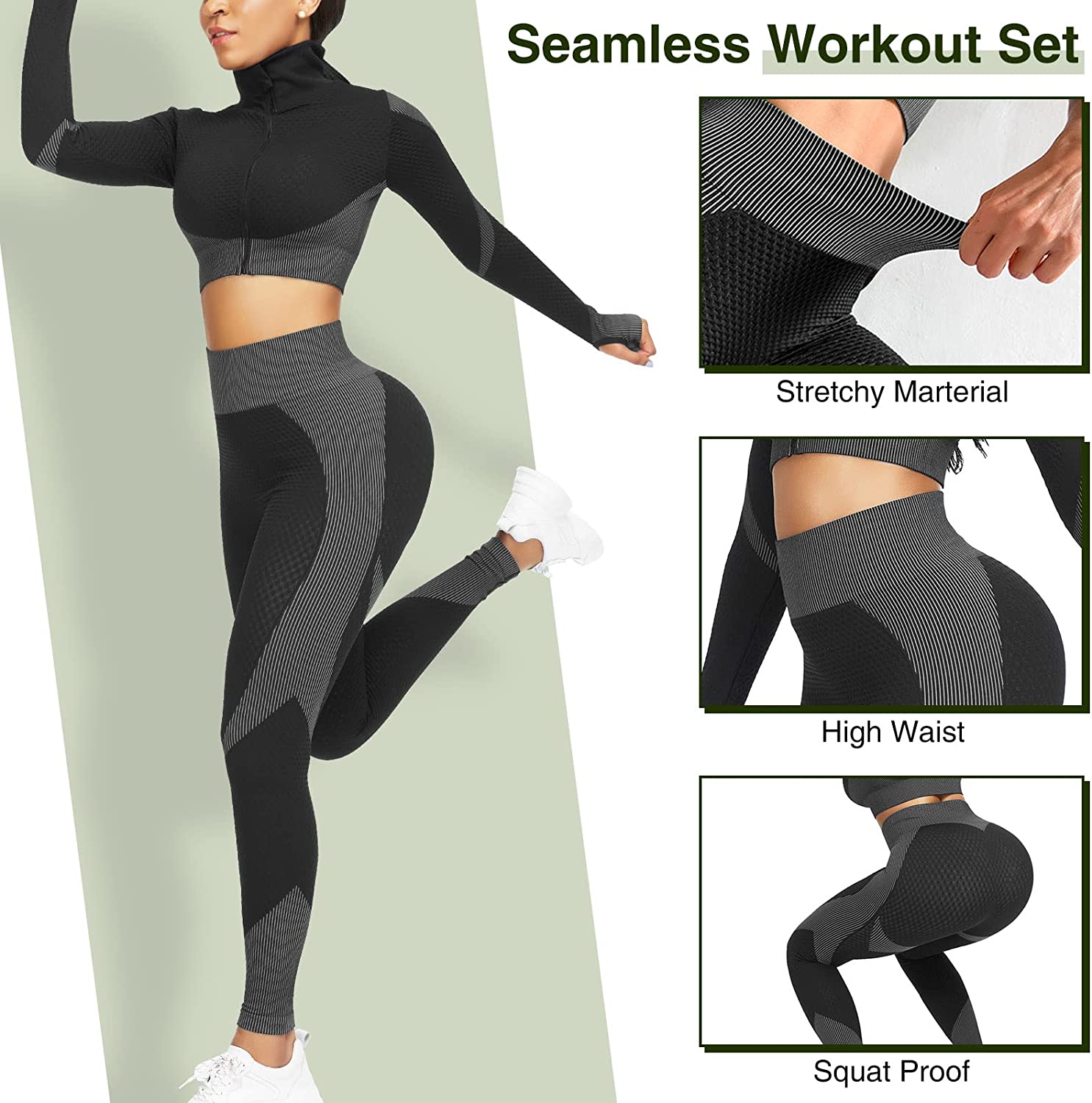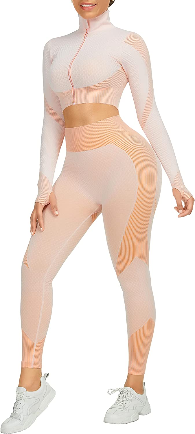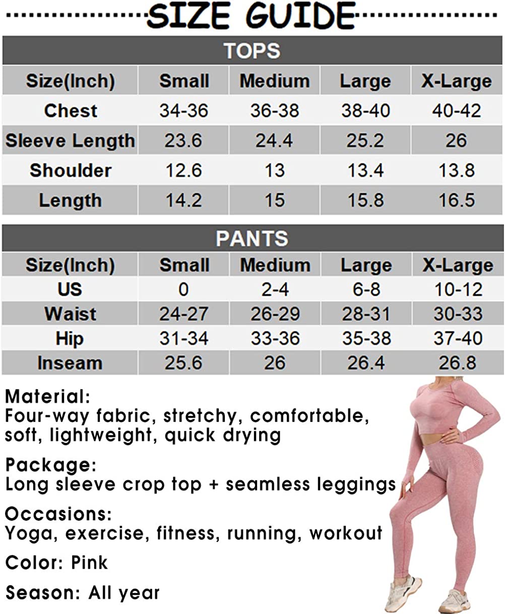 YOFIT Women's Workout Outfit 2 Pieces Seamless High Waist Yoga Leggings with Long Sleeve Crop Top Gym Clothes Set. Pink