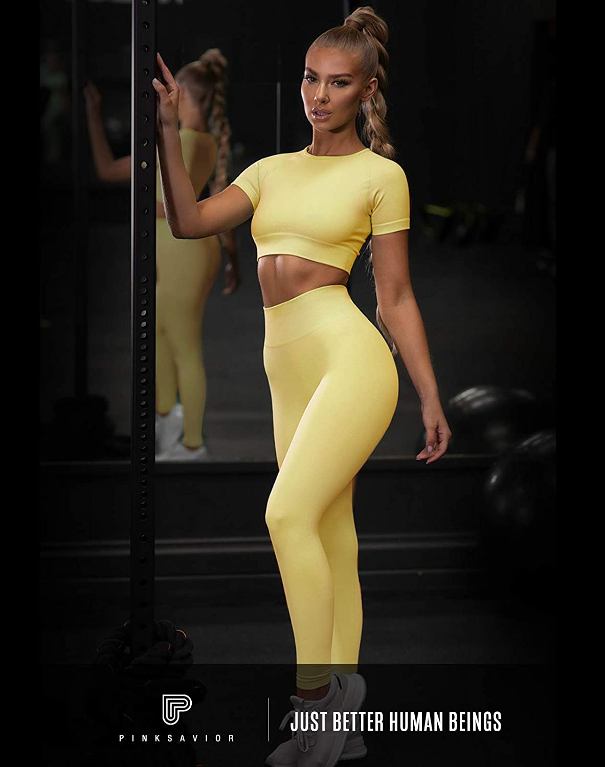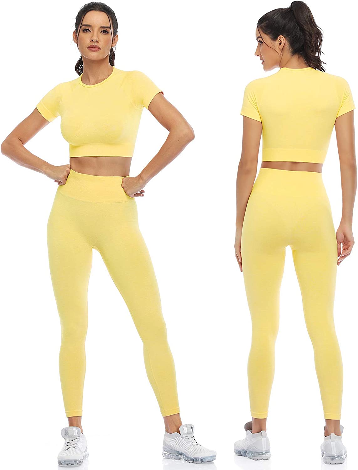 PINKSAVIOR Women's Two Piece Outfits Yoga Pants Set Seamless High Waist Leggings and Quick-Dry Yoga Crop Tops Athletic Sports Set. Yellow