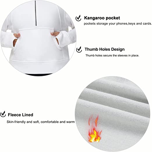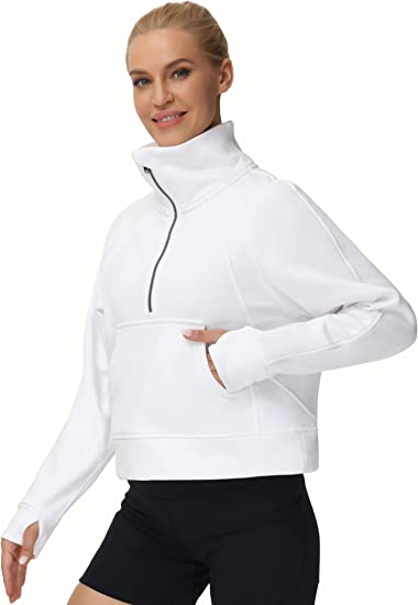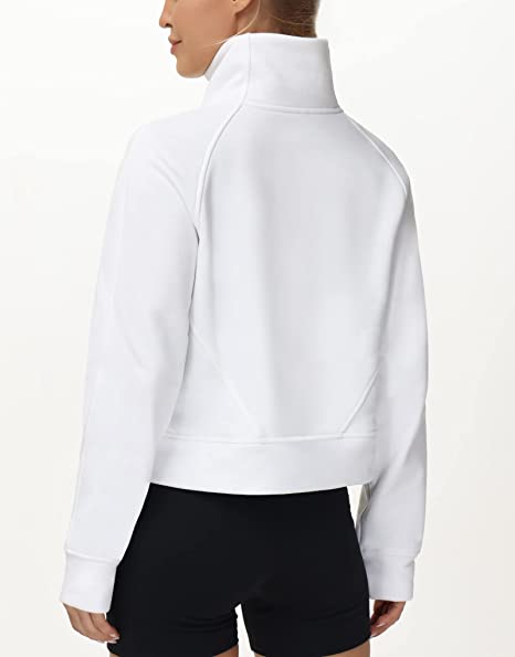 Women's Half Zip Pullover Sweatshirt Fleece Stand Collar Crop Sweatshirt with Pockets Thumb Hole. White