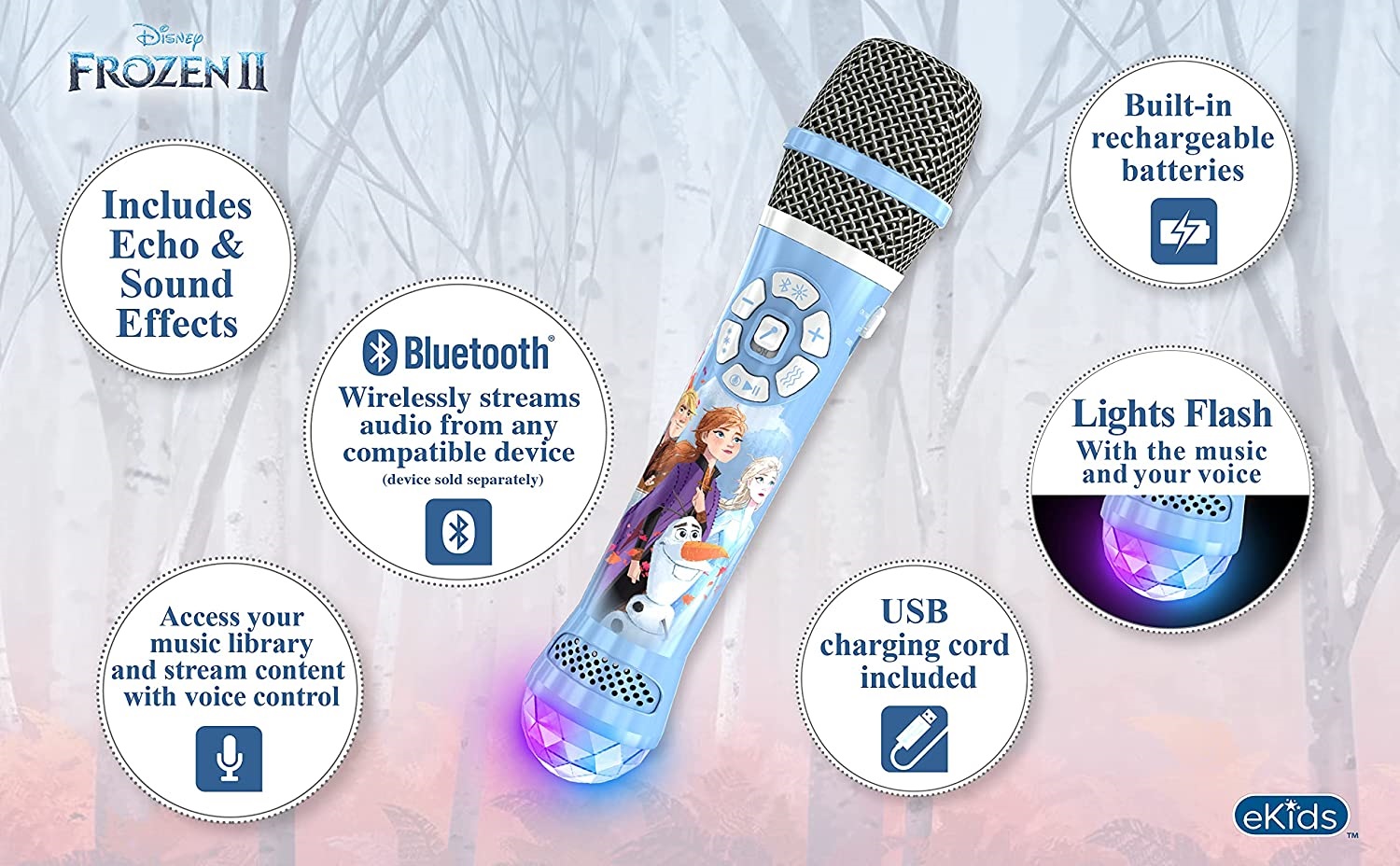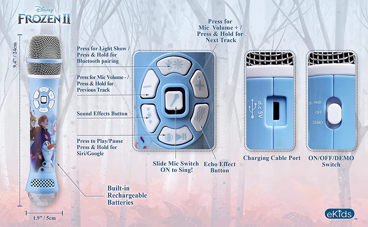 eKids Disney Blue Frozen 2 Bluetooth Karaoke Microphone. LED Disco. 6 Years +