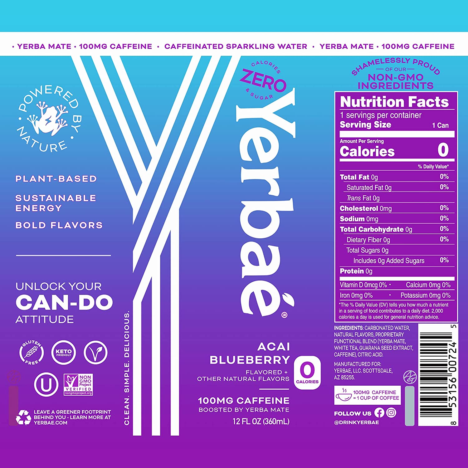 Yerbae Sparkling Water. Acai Blueberry Fruit Flavored Seltzer. Energy Drink. 12 Pack