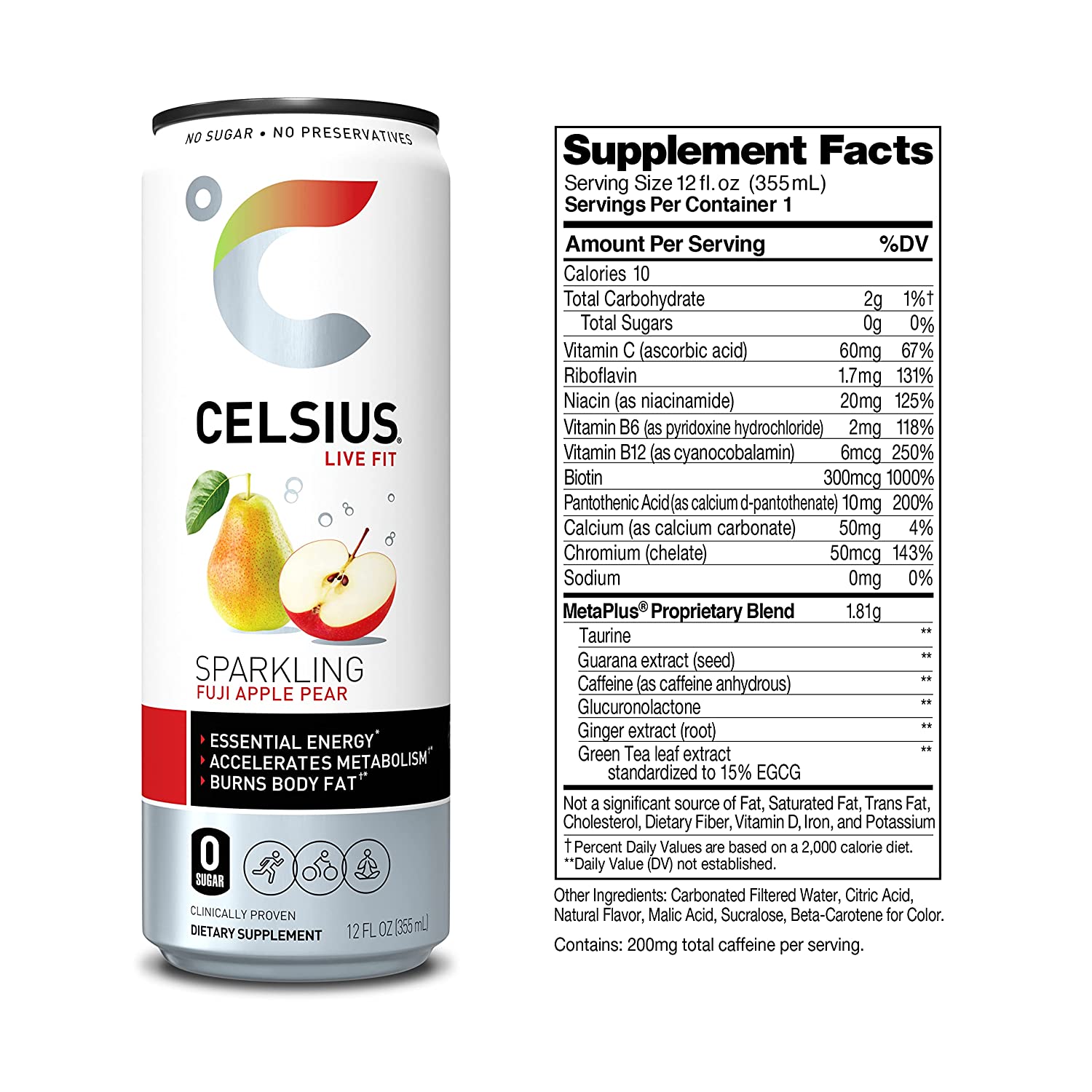 CELSIUS Essential Energy Drink 12 Fl Oz. Sparkling Fuji Apple Pear (Pack of 12)