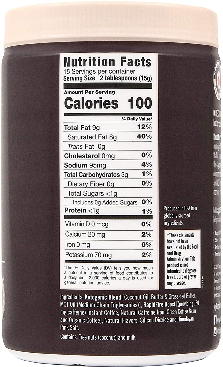 Rapid fire Ketogenic Fair Trade Instant Keto Coffee Mix. Supports Energy. Metabolism. and Weight Loss. Grass Fed Butter. MCTs & Himalayan Salt. 15 servings. Hazelnut Flavor. 7.93 Ounce