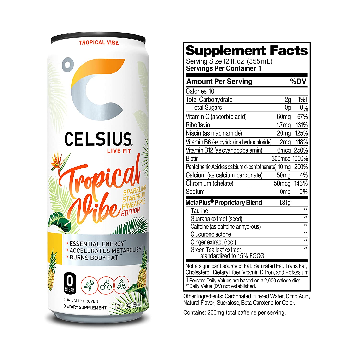 CELSIUS Essential Energy Drink 12 Fl Oz. Zero Sugar. Sparkling Tropical Vibe (Pack of 12)