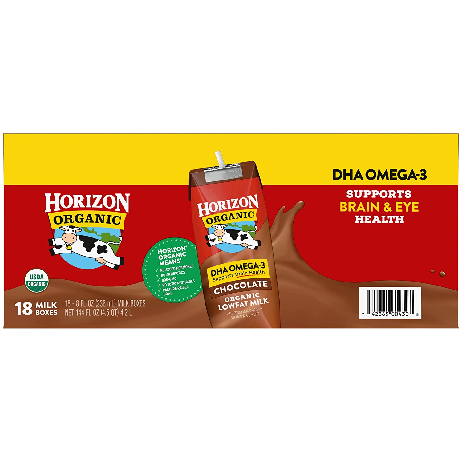 Horizon Organic Shelf-Stable 1% Lowfat Milk Boxes with DHA Omega-3. Chocolate. 8 oz.. 18 Pack