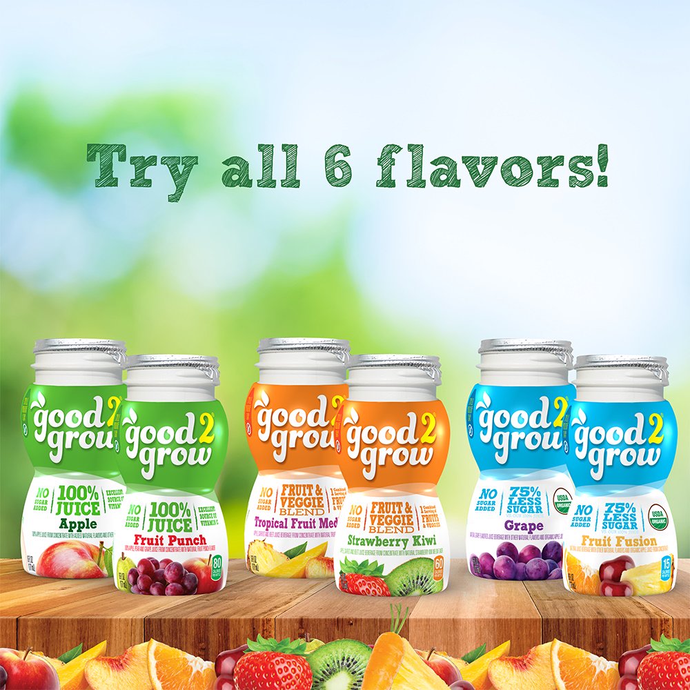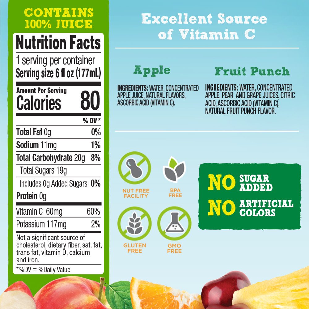good2grow 100% Apple and Fruit Punch Juice Refill. Variety Pack of 24. 6-Ounce BPA-Free Juice Bottles. Non-GMO w/ No Added Sugar. and an Excellent Source of Vitamin C. SPILL PROOF TOPS NOT INCLUDED