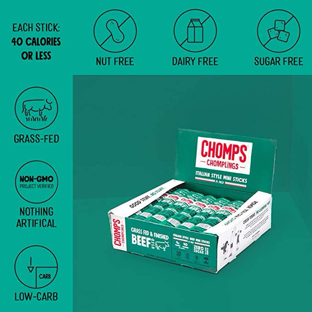 CHOMPS MINI Grass Fed Italian Style Beef Jerky Meat Snack Sticks. Keto. Paleo. Whole30 Approved. Low Carb. High Protein. Gluten Free. Sugar Free. Non-GMO. 40 Calories. 0.5 Oz Sticks. 24 Pack