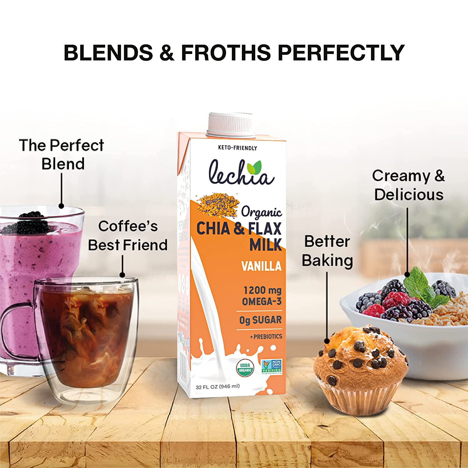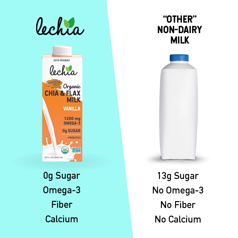 Lechia Organic Chia & Flax Milk Vanilla. 1200mg Omega-3. Plant-Based. Keto. 32oz (6 Pack)