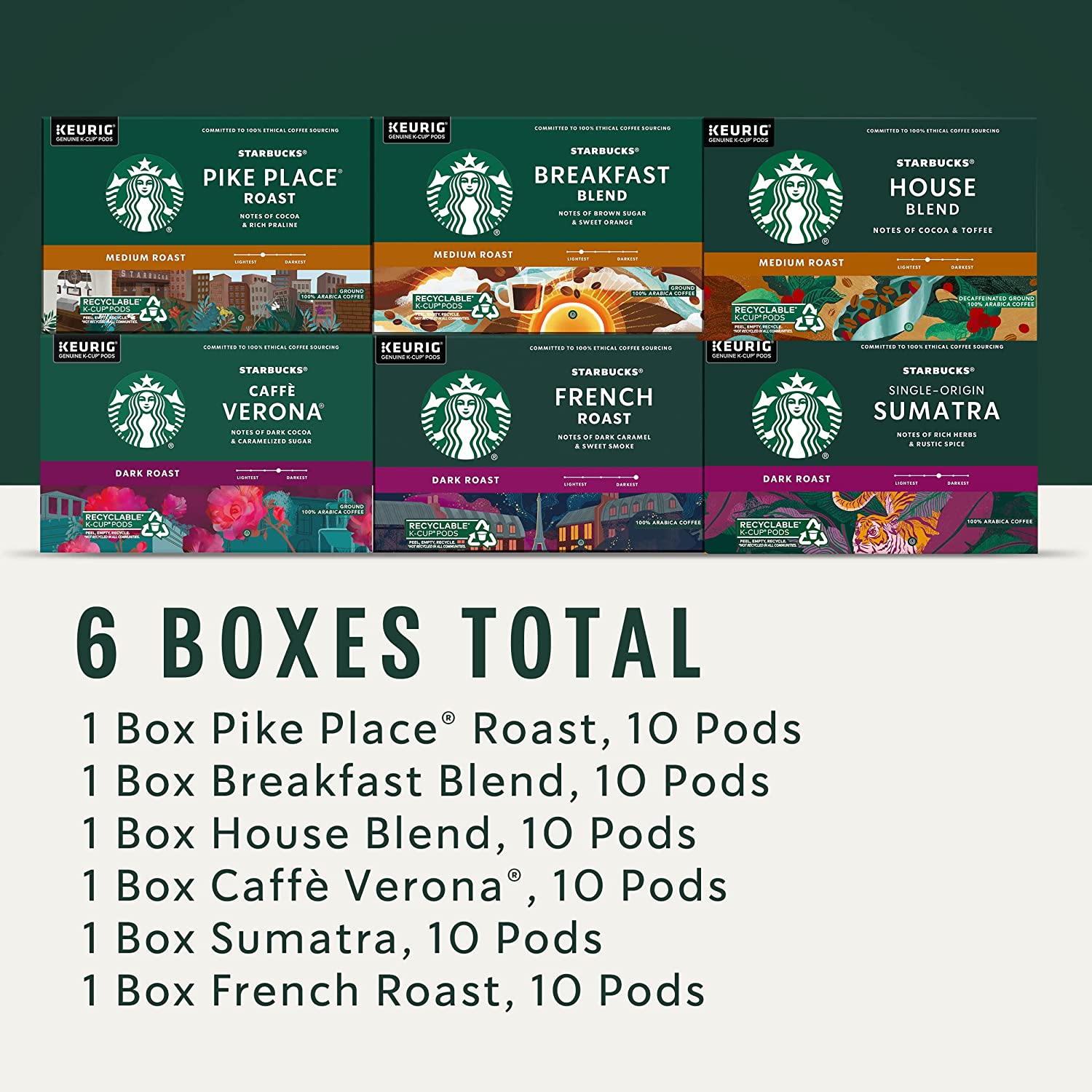 Starbucks K-Cup Coffee Pods Medium & Dark Roast Variety Pack for Keurig Brewers. 100% Arabica. 6 boxes (60 pods total)