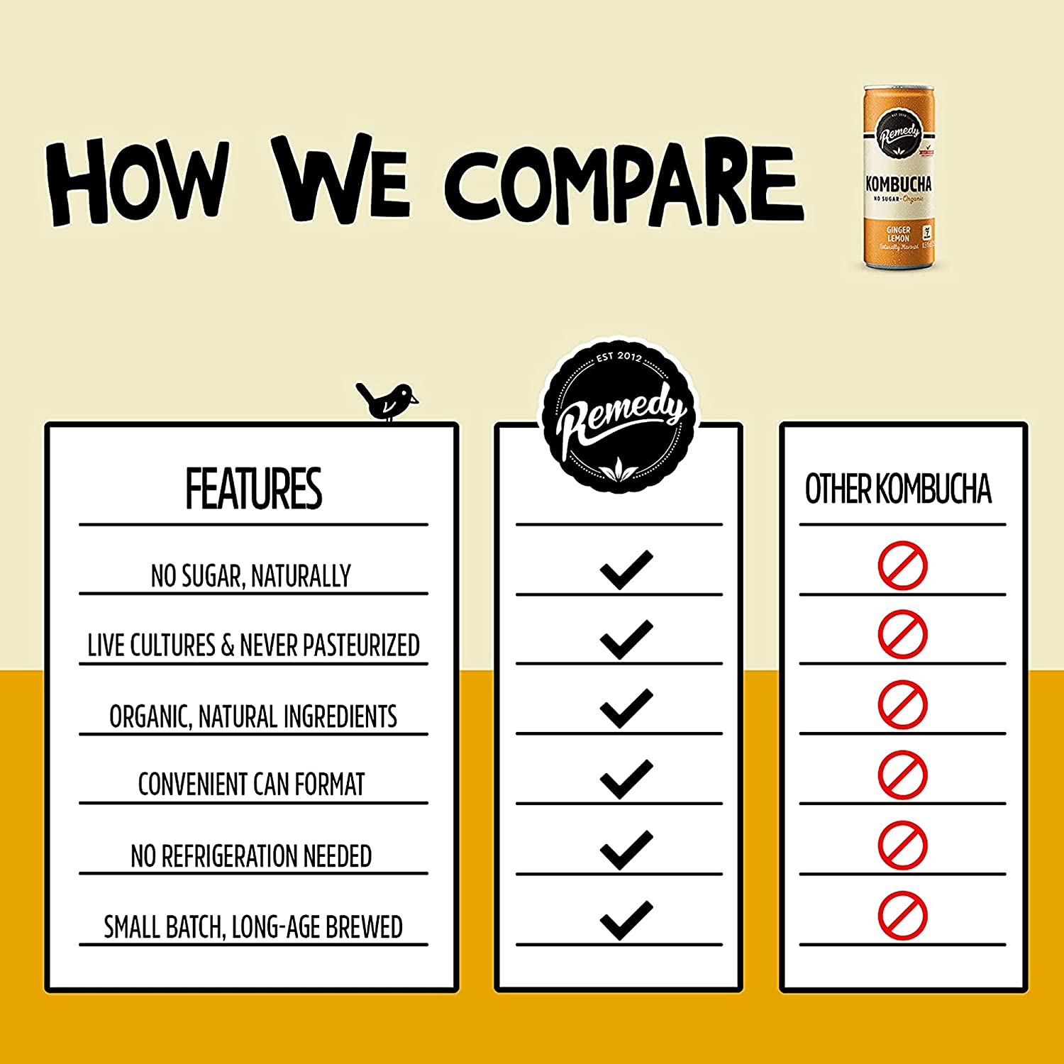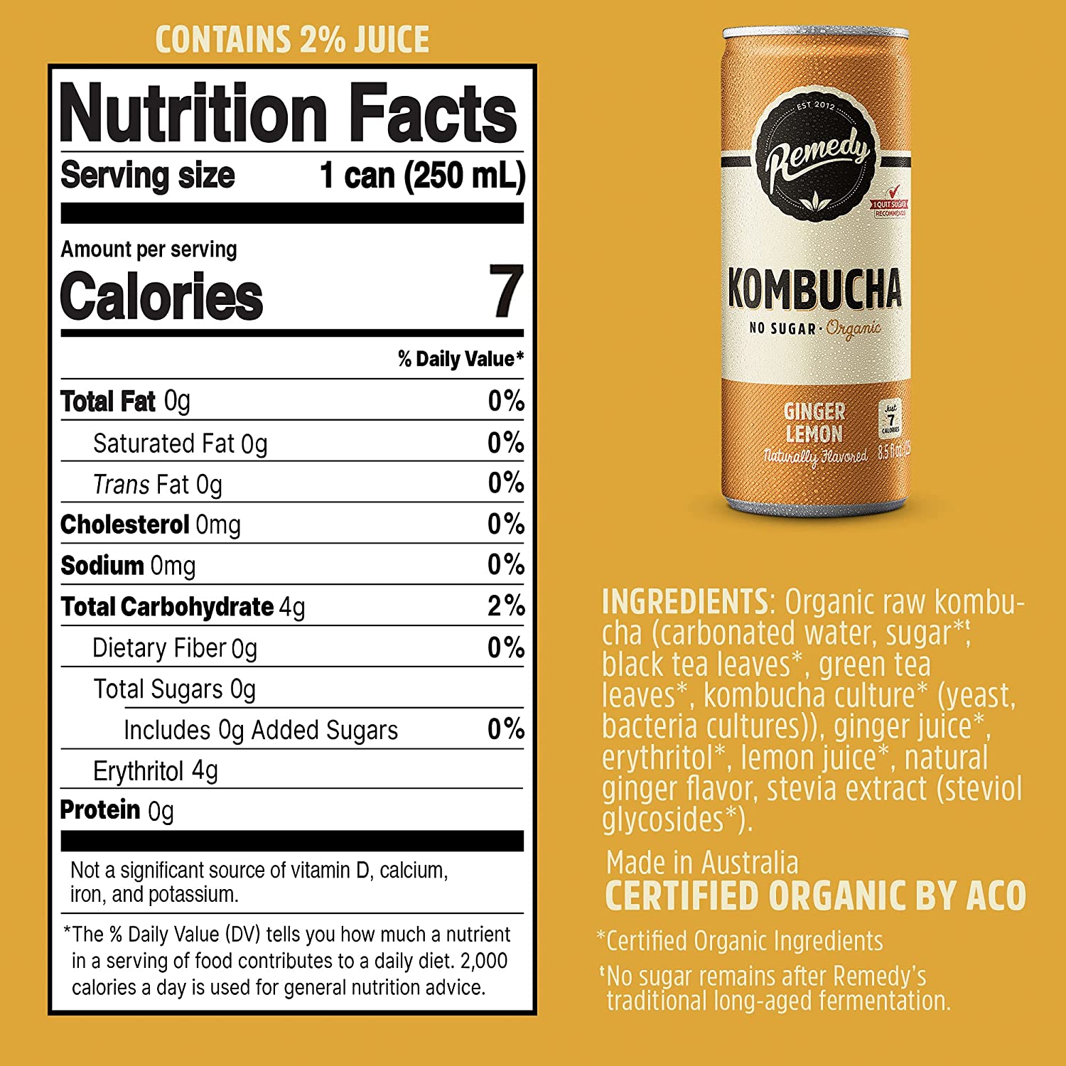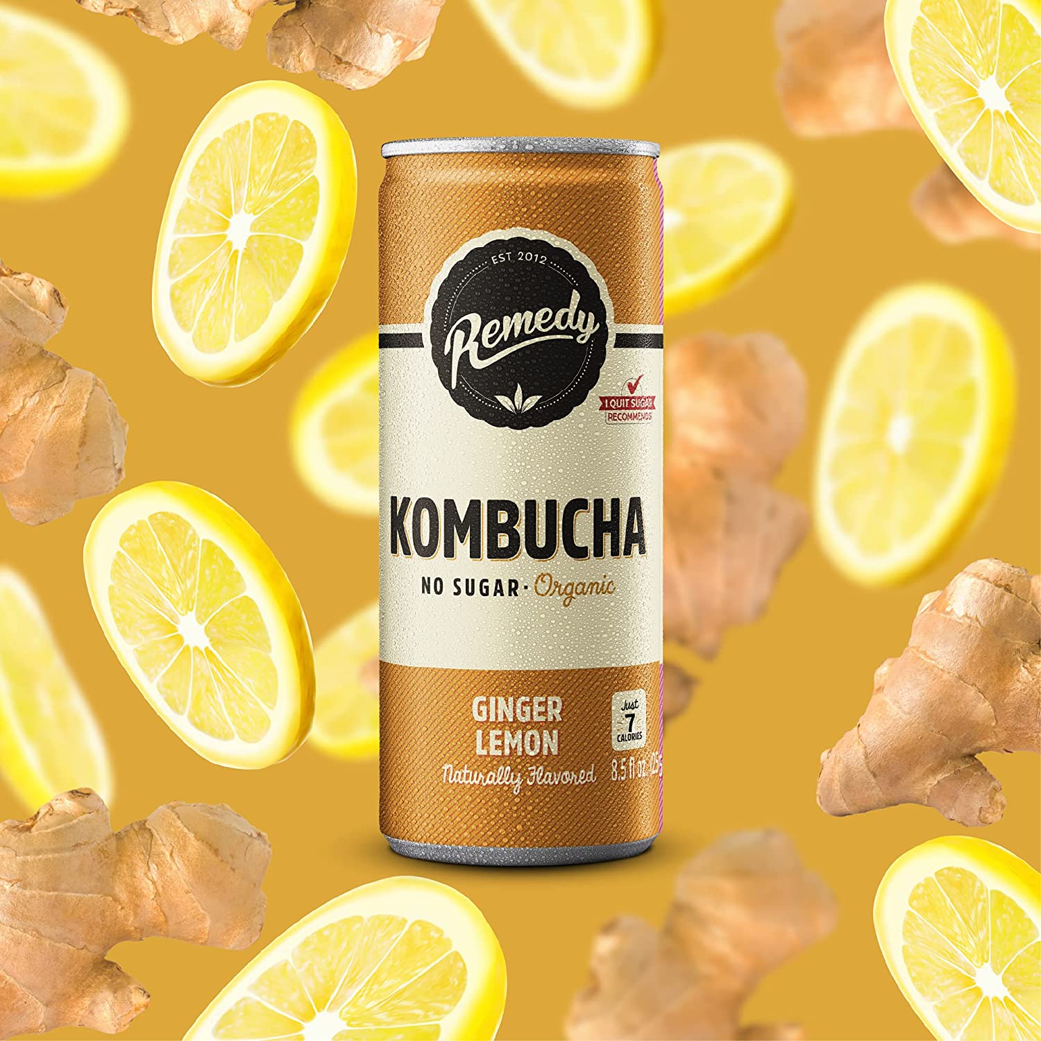 Remedy Kombucha Tea Organic Drink - Sugar Free. Keto. Vegan & Gluten Free - Sparkling Live Cultured. Small Batch Brewed Beverage - Ginger Lemon - 8.5 Fl Oz Can. 24-Pack