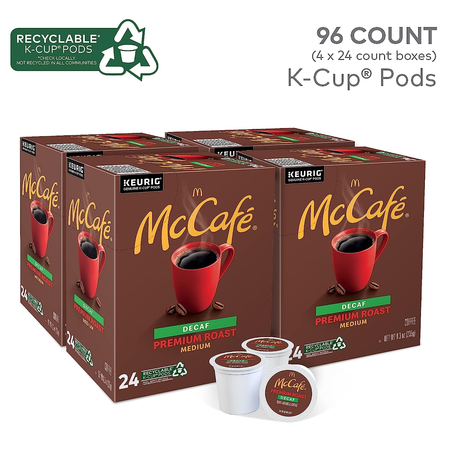 McCafé Premium Roast Decaf. Keurig Single Serve K-Cup Pods. Medium Roast Coffee Pods. 96 Count of pack of 4 of 24 K-Cup Pods each