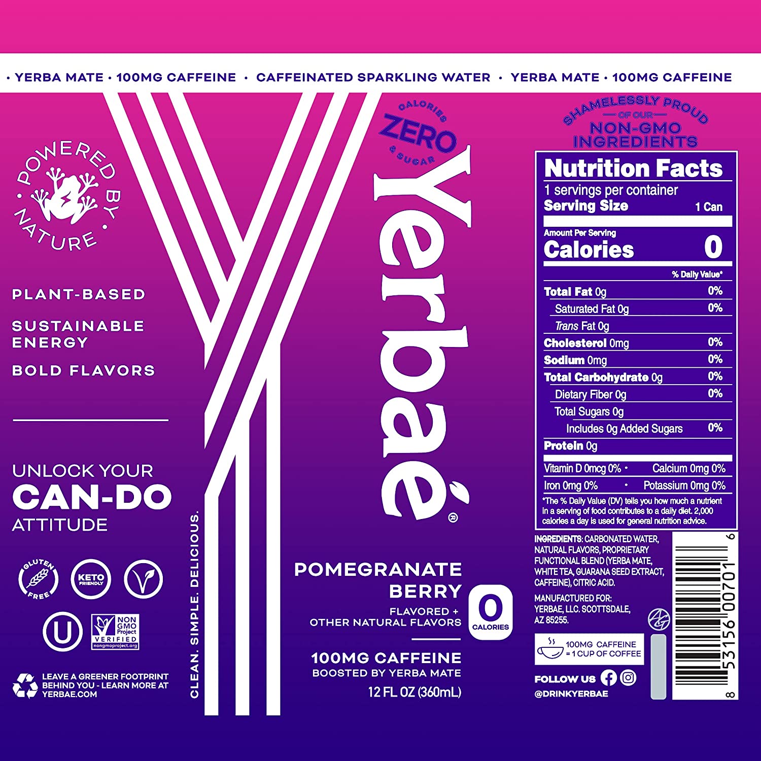 Yerbae Sparkling Water. Acai Blueberry Fruit Flavored Seltzer. Energy Drink. 12 Pack