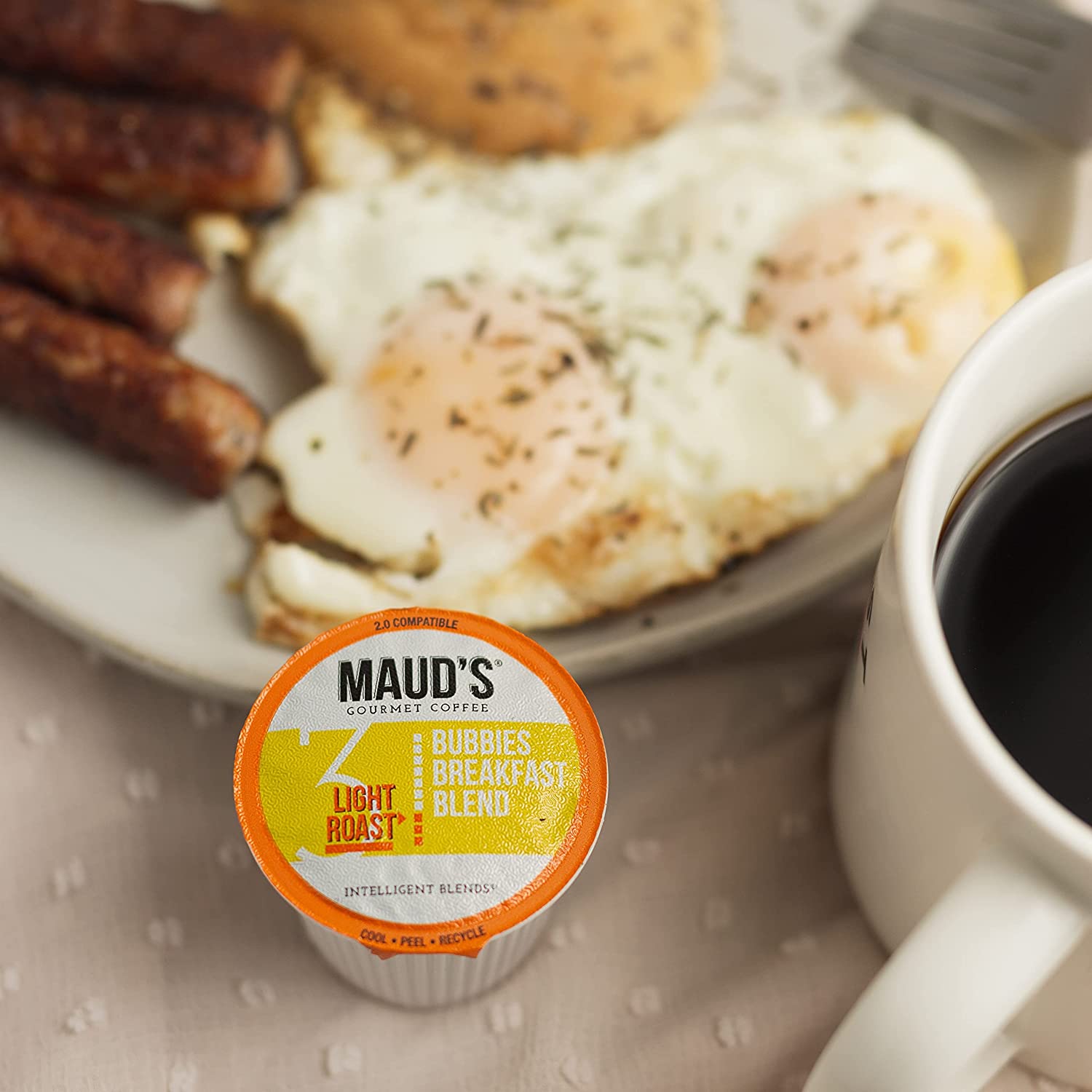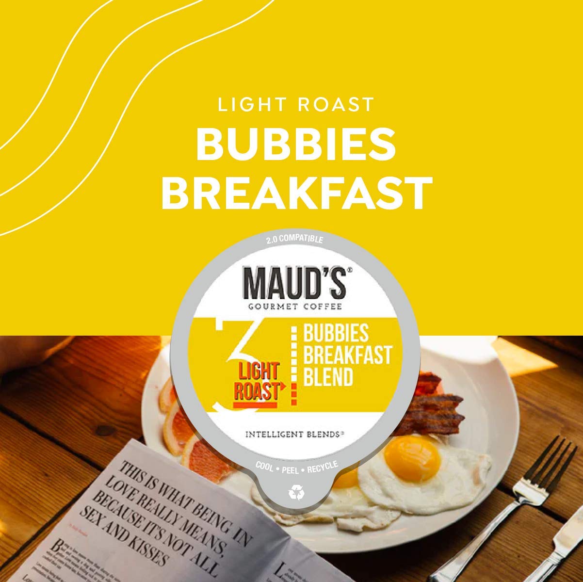 Maud-s Breakfast Blend Coffee. (Bubbies Breakfast Blend). 100ct. Solar Energy Produced Recyclable Single Serve Breakfast Blend Coffee Pods. 100% Arabica Coffee California Roasted. KCup Compatible
