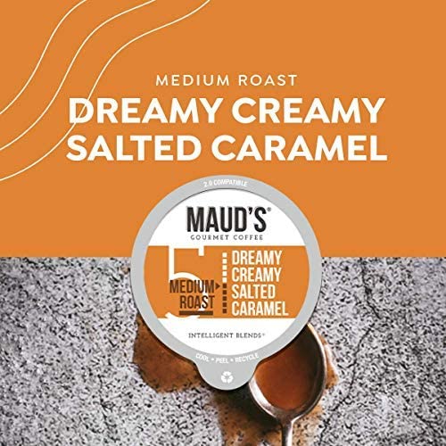Maud-s Salted Caramel Coffee (Dreamy Creamy Caramel). 100ct. Solar Energy Produced Recyclable Single Serve Salted Caramel Flavored Coffee Pods – 100% Arabica Coffee California Roasted. KCup Compatible