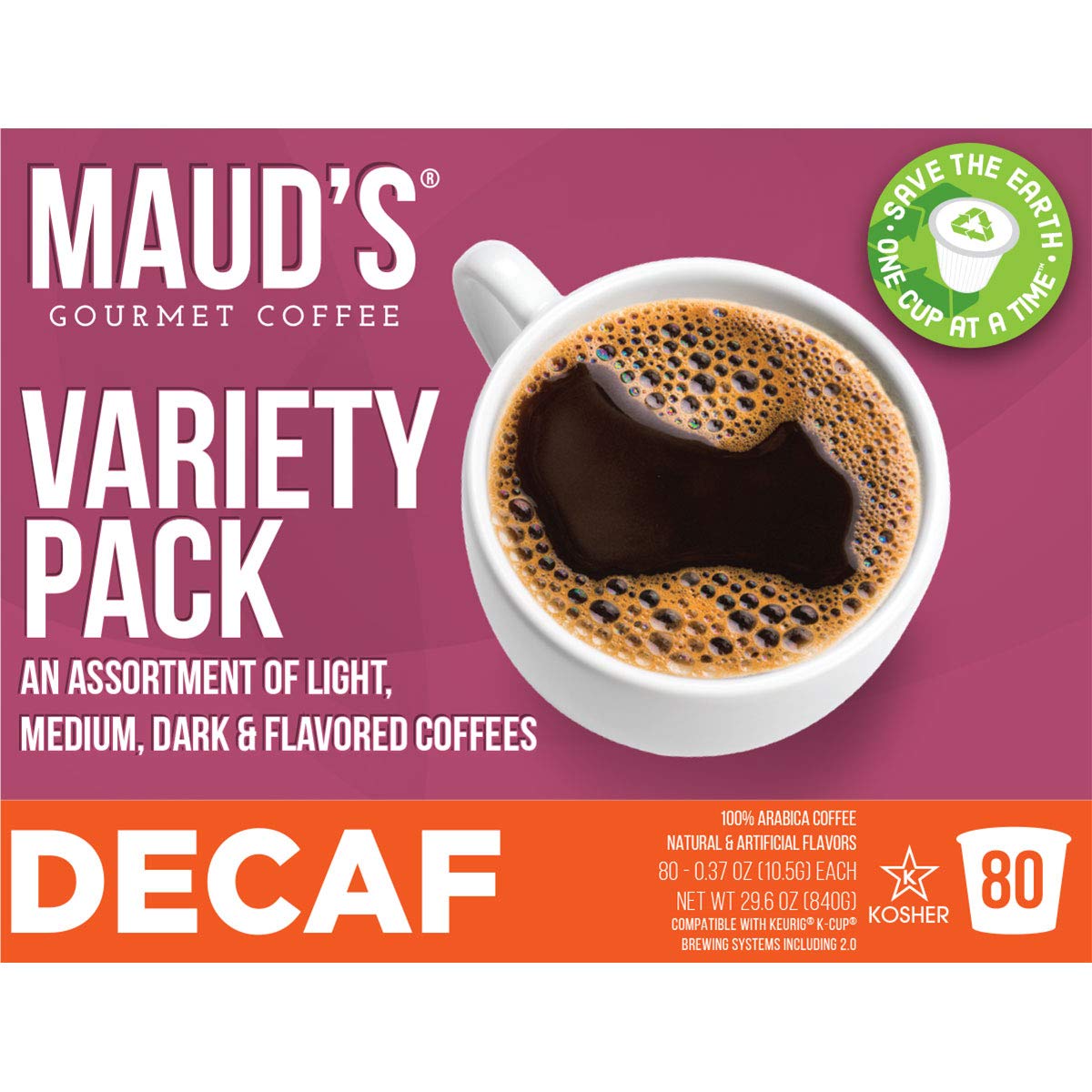 Maud-s Decaf Coffee Variety Pack. 80ct. Solar Energy Produced Recyclable Single Serve Swiss Water Processed Decaf Coffee Pods - 100% Arabica Decaffeinated Coffee California Roasted. KCup Compatible