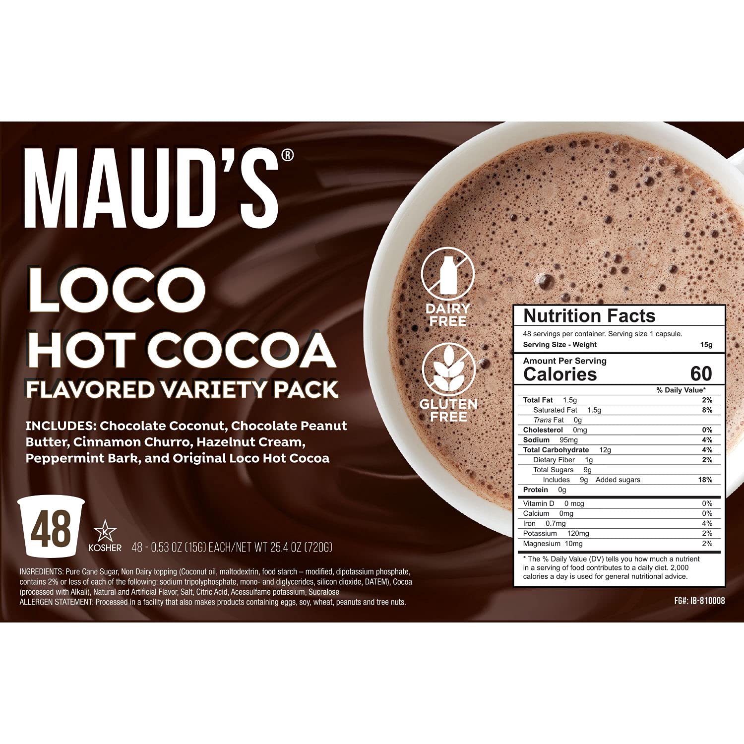 Maud-s Flavored Hot Chocolate Variety Pack. 48ct. Solar Energy Produced Recyclable Single Serve Gluten & Dairy Free Flavored Hot Cocoa Pods. 100% California Blended Hot Cocoa Variety. KCup Compatible