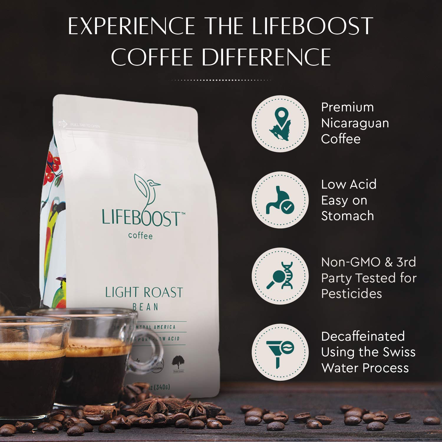 Lifeboost Coffee Medium Swiss Water Decaf Coffee Whole Bean - Low Acid Single Origin USDA Decaf Organic Coffee - Coffee Beans Third Party Tested For Mycotoxins & Pesticides - 12 Ounces