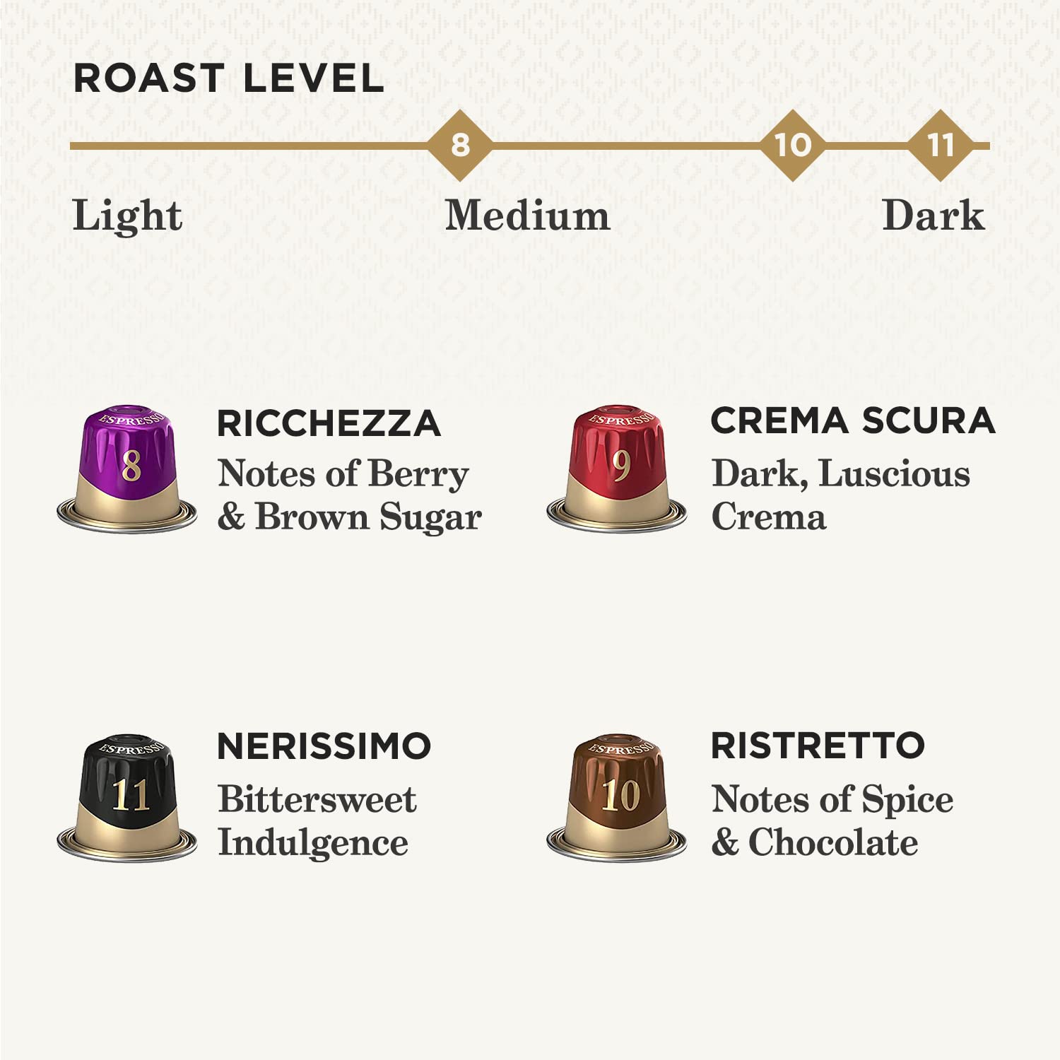 Peet-s Coffee Espresso Capsules Variety Pack. 50 Count Single Cup Coffee Pods. Compatible with Nespresso Original Brewers. Crema Scura. Decaffeinato Ristretto. Nerissimo. Ricchezza. Ristretto