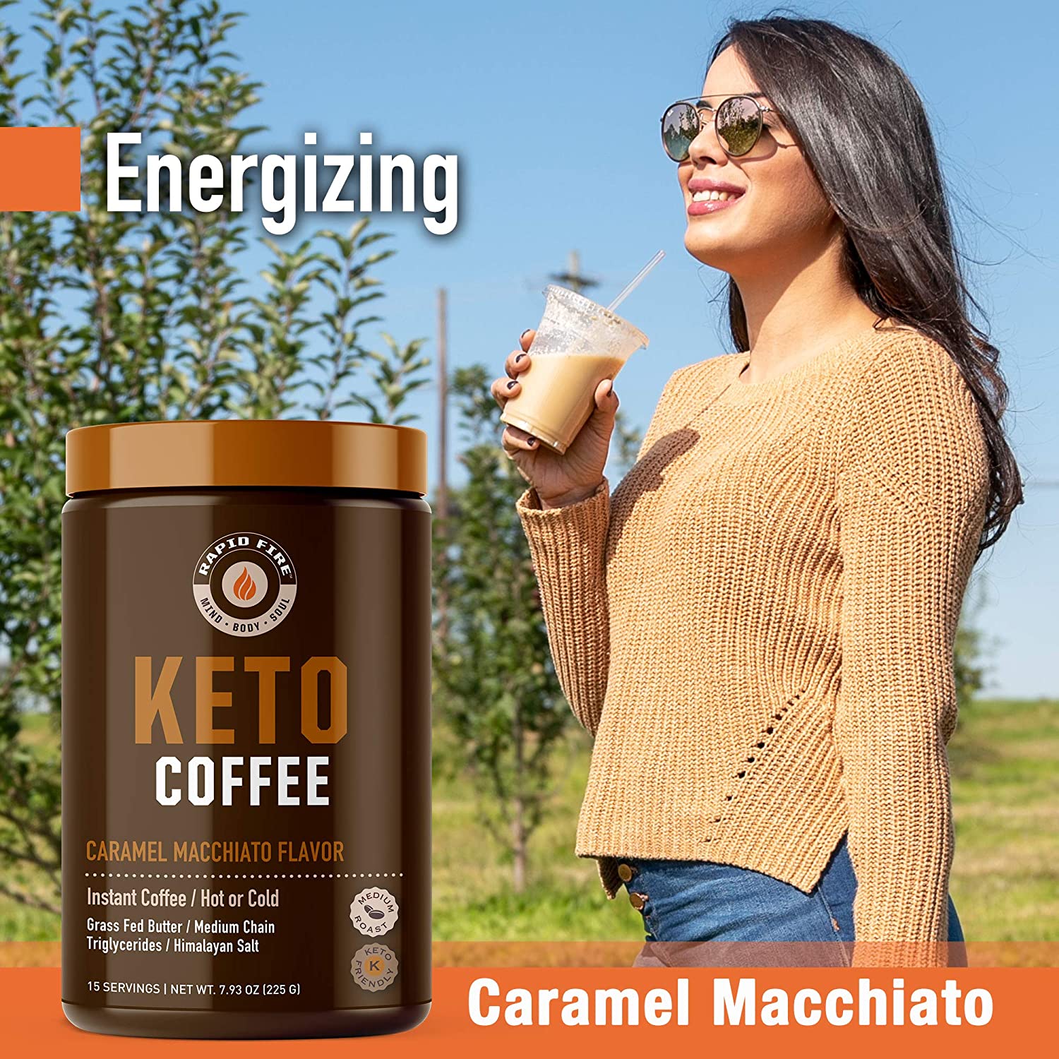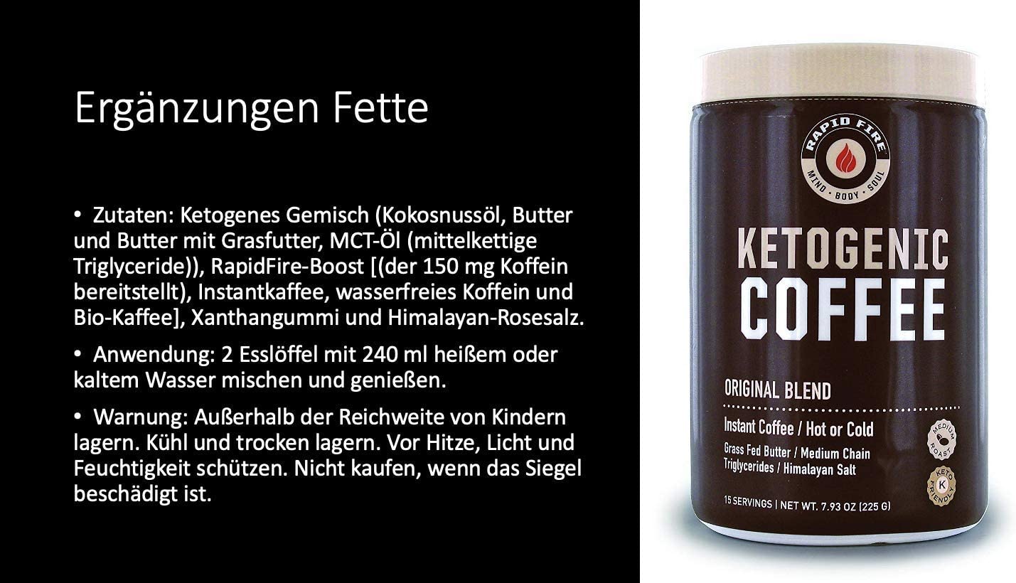 Rapid fire Ketogenic Fair Trade Instant Keto Coffee Mix. Supports Energy. Metabolism. and Weight Loss. Grass Fed Butter. MCTs & Himalayan Salt. 15 servings. Caramel Macchiato Flavor. 7.93 Ounce