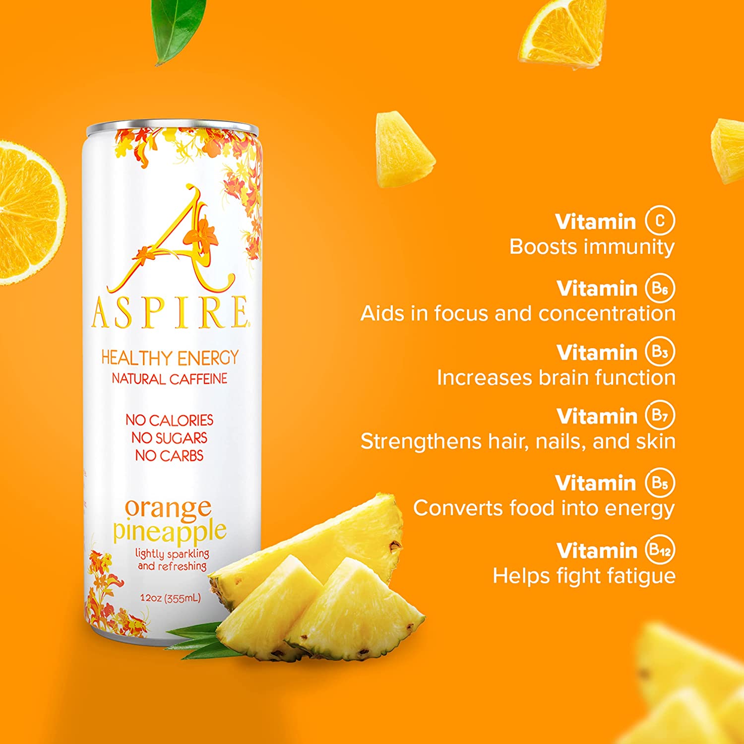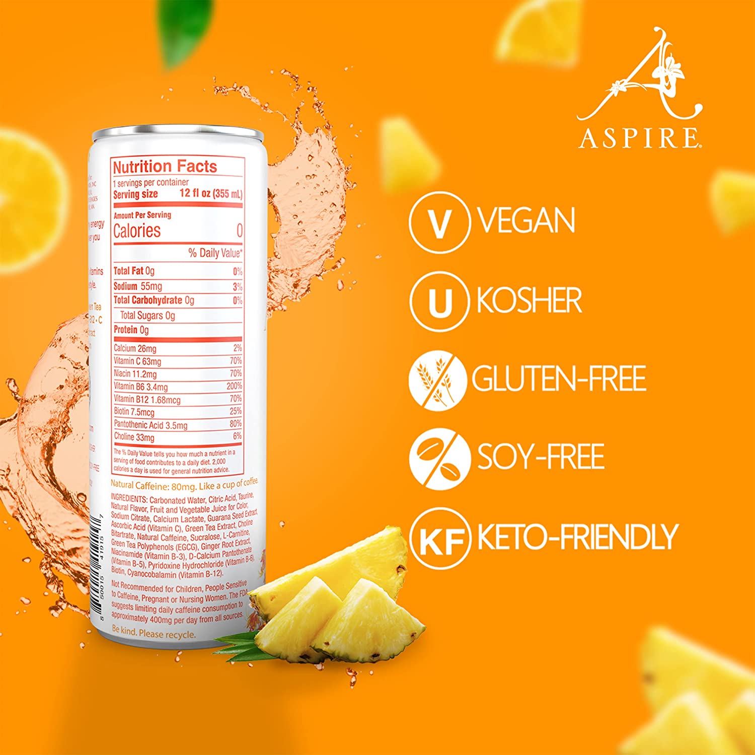 Aspire Healthy Energy Drink. Orange Pineapple (Pack of 12) 12 oz Cans. Natural Caffeine and Zero Sugar. Coffee Substitute. Vitamins B & C. Keto. Vegan. and Kosher Friendly