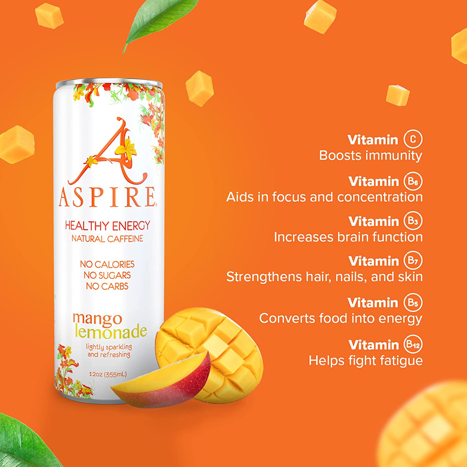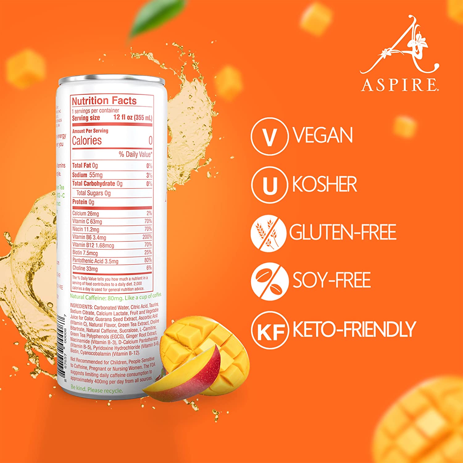 Aspire Healthy Energy Drink. Mango Lemonade (Pack of 12) 12 oz Cans. Natural Caffeine and Zero Sugar. Coffee Substitute. Vitamins B & C. Keto. Vegan. and Kosher Friendly