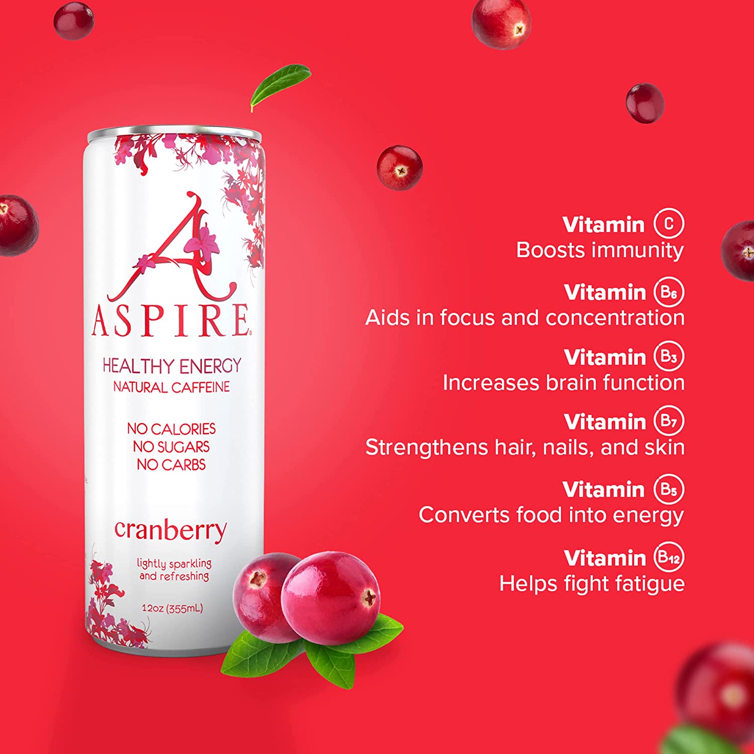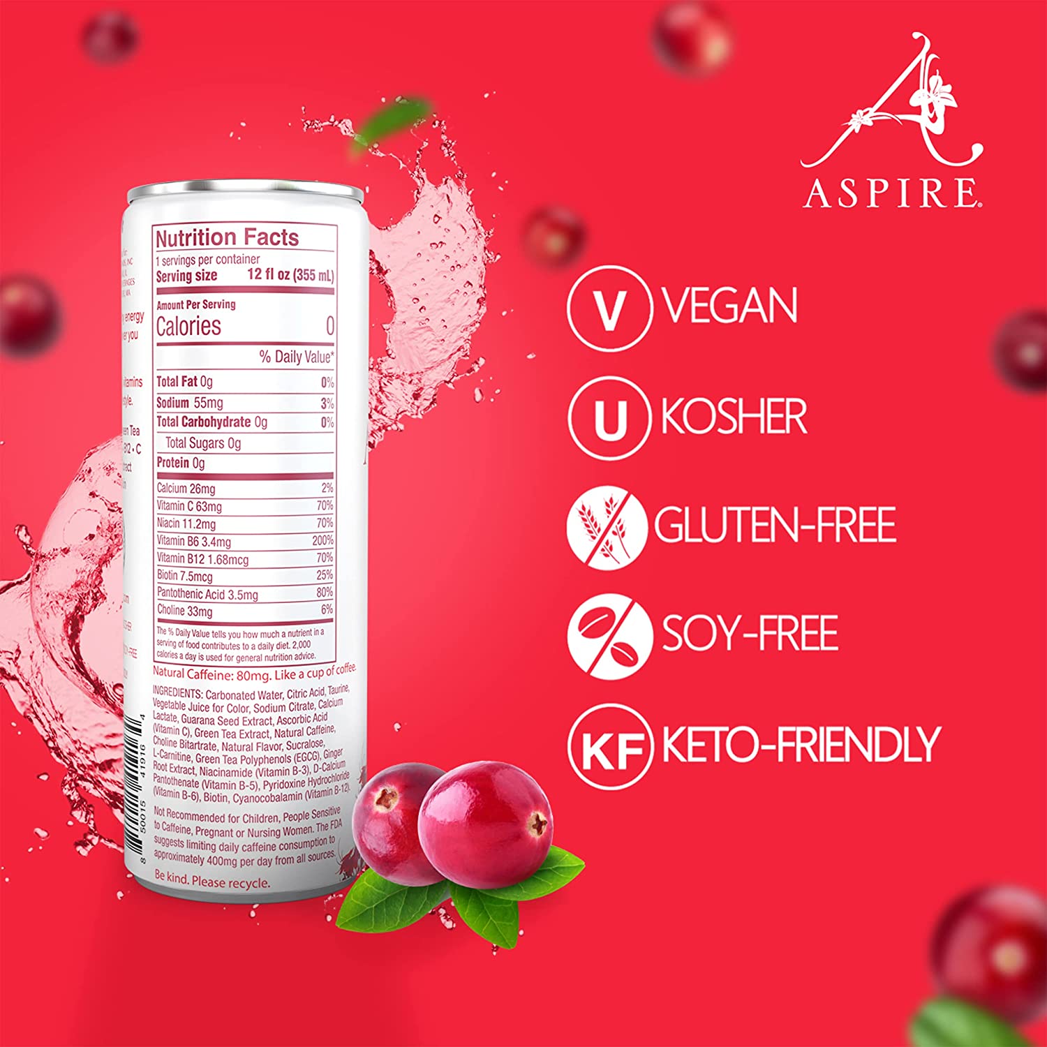 Aspire Healthy Energy Drink. Cranberry (Pack of 12) 12 oz Cans. Natural Caffeine and Zero Sugar. Coffee Substitute. Vitamins B & C. Keto. Vegan. and Kosher Friendly