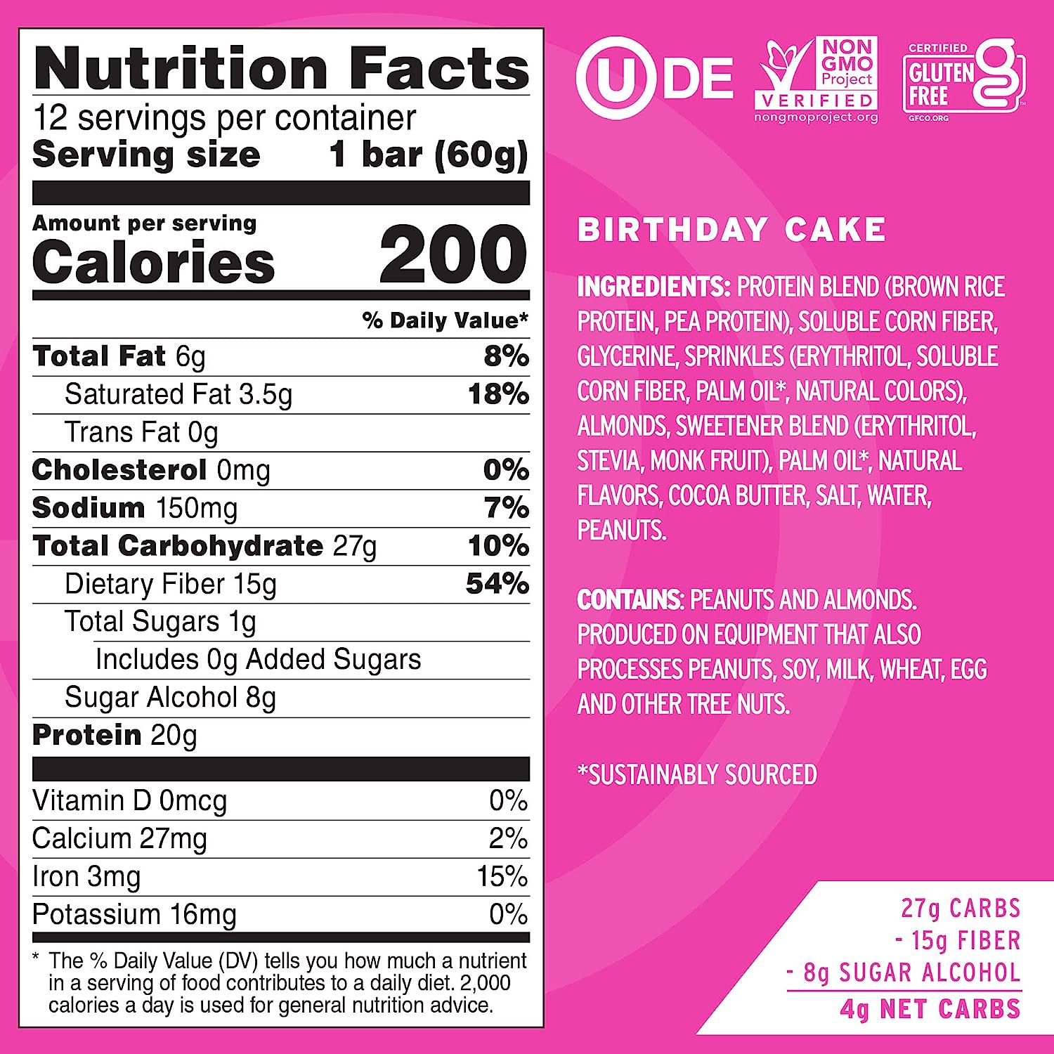 No Cow Dipped High Protein Bars. Birthday Cake. 20g Plant Based Vegan Protein. Keto Friendly. Low Sugar. Low Carb. Low Calorie. Gluten Free. Naturally Sweetened. Dairy Free. Non GMO. Kosher. 12 Pack