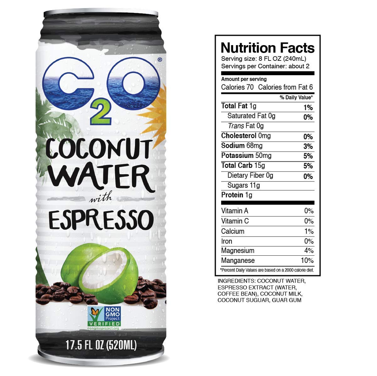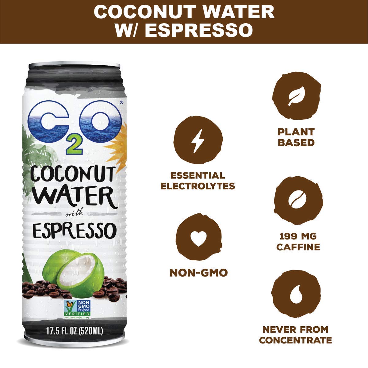 C2O Pure Coconut Water with Espresso | Plant Based | Non-GMO | Dairy Free | Essential Electrolytes | 17.5 Fl Oz (Pack of 12)