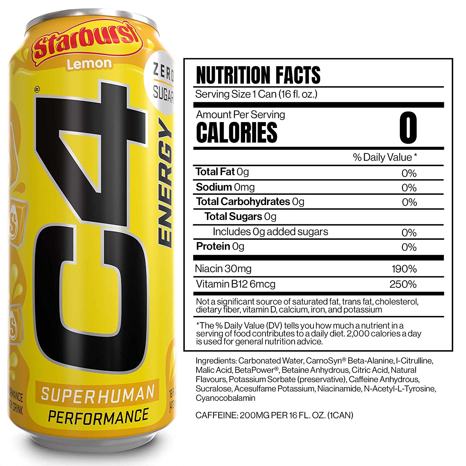 Cellucor C4 Energy Drink. Starburst Lemon. Carbonated Sugar Free with no Artificial Colors or Dyes. 16 Oz. 12 Count