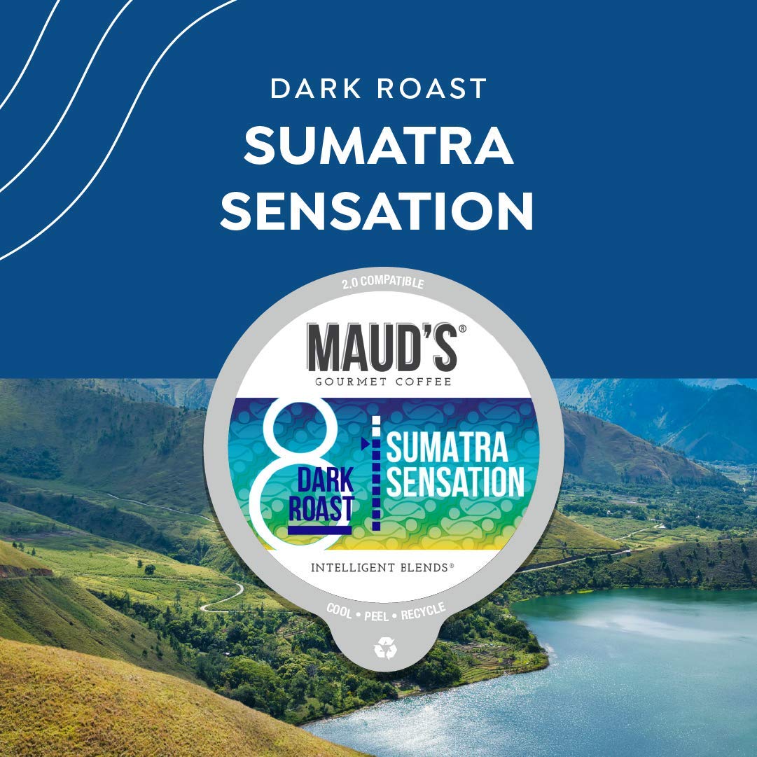 Maud-s Dark Roast Sumatra Coffee (Sumatra Sensation). 100ct. Recyclable Single Serve Single Origin Dark Roast Coffee Pods – 100% Arabica Coffee California Roasted. Sumatra Coffee K Cups Compatible
