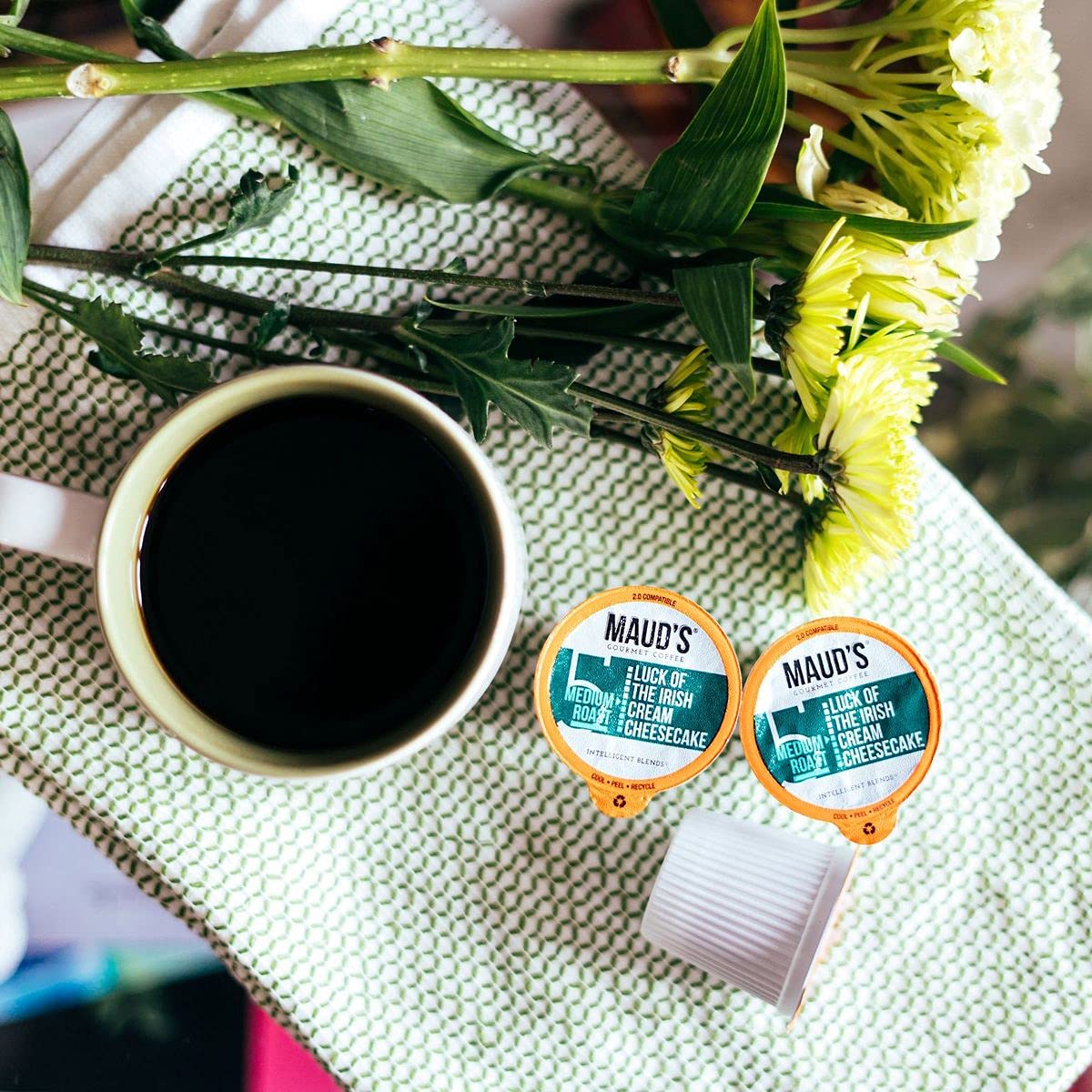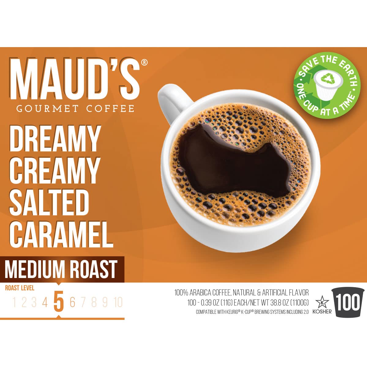Maud-s Salted Caramel Coffee (Dreamy Creamy Caramel). 100ct. Solar Energy Produced Recyclable Single Serve Salted Caramel Flavored Coffee Pods – 100% Arabica Coffee California Roasted. KCup Compatible
