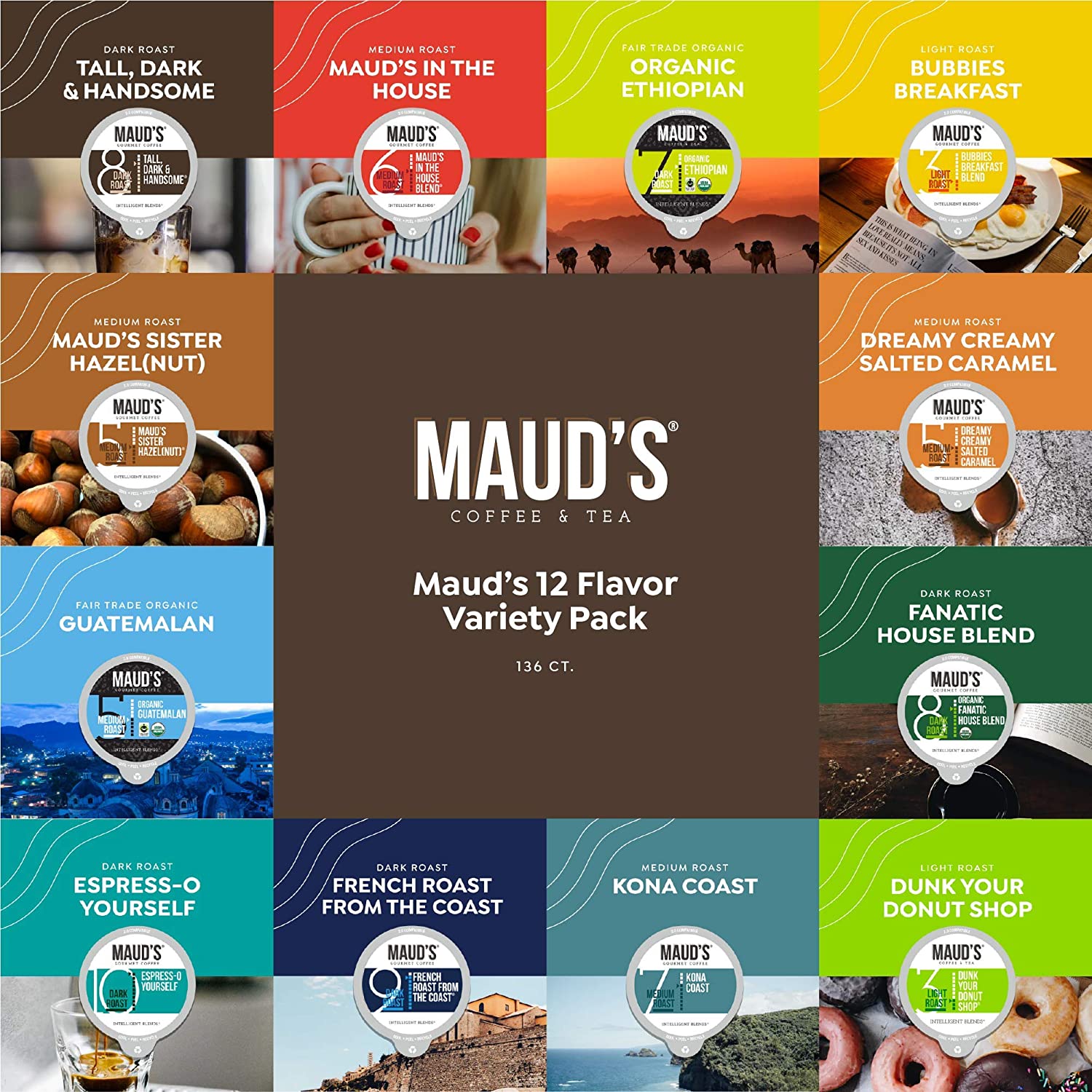 Maud-s 12 Flavor Bulk Coffee Variety Pack (Variety Family Pack). 136ct. Solar Energy Produced Recyclable Single Serve Bulk Variety Coffee Pods – 100% Arabica Coffee California Roasted. KCup Compatible